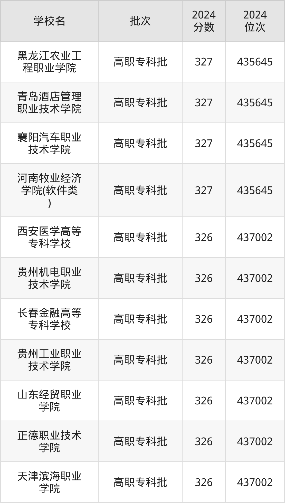 2024年河南高考理科326分(435647名~437003名)能上的大学有西安医学高等专科学校、天津滨海职业学院、正德职业技术学院、山东经贸职业学院等。