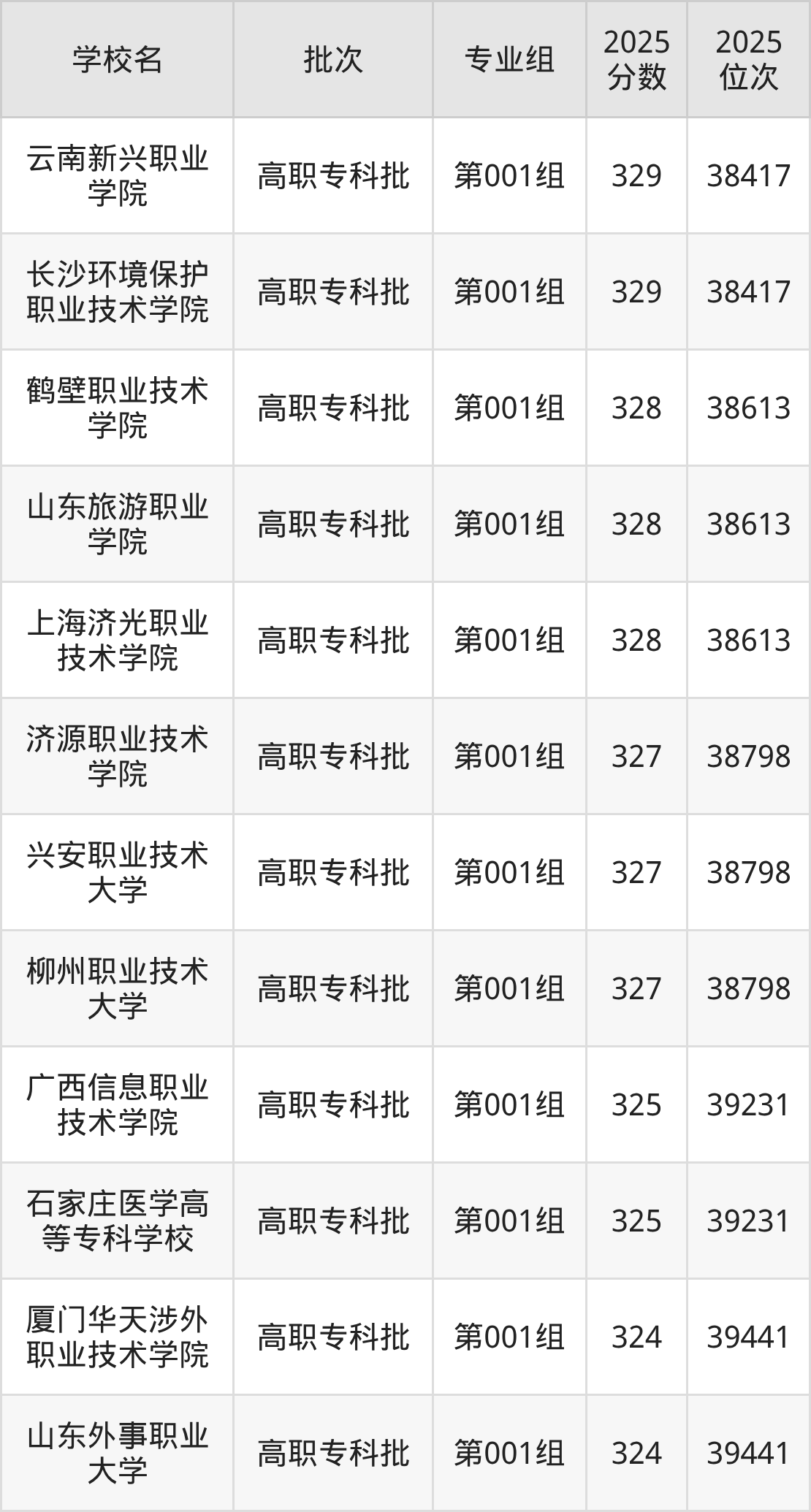 2025年黑龙江高考历史类326分(38799名~38996名)录取位次低于该区间(较稳妥)的有石家庄医学高等专科学校第001组(39231名)、广西信息职业技术学院第001组(39231名)等;录取位次高于该区间(可冲)的有柳州职业技术大学第001组(38798名)、兴安职业技术大学第001组(38798名)等。