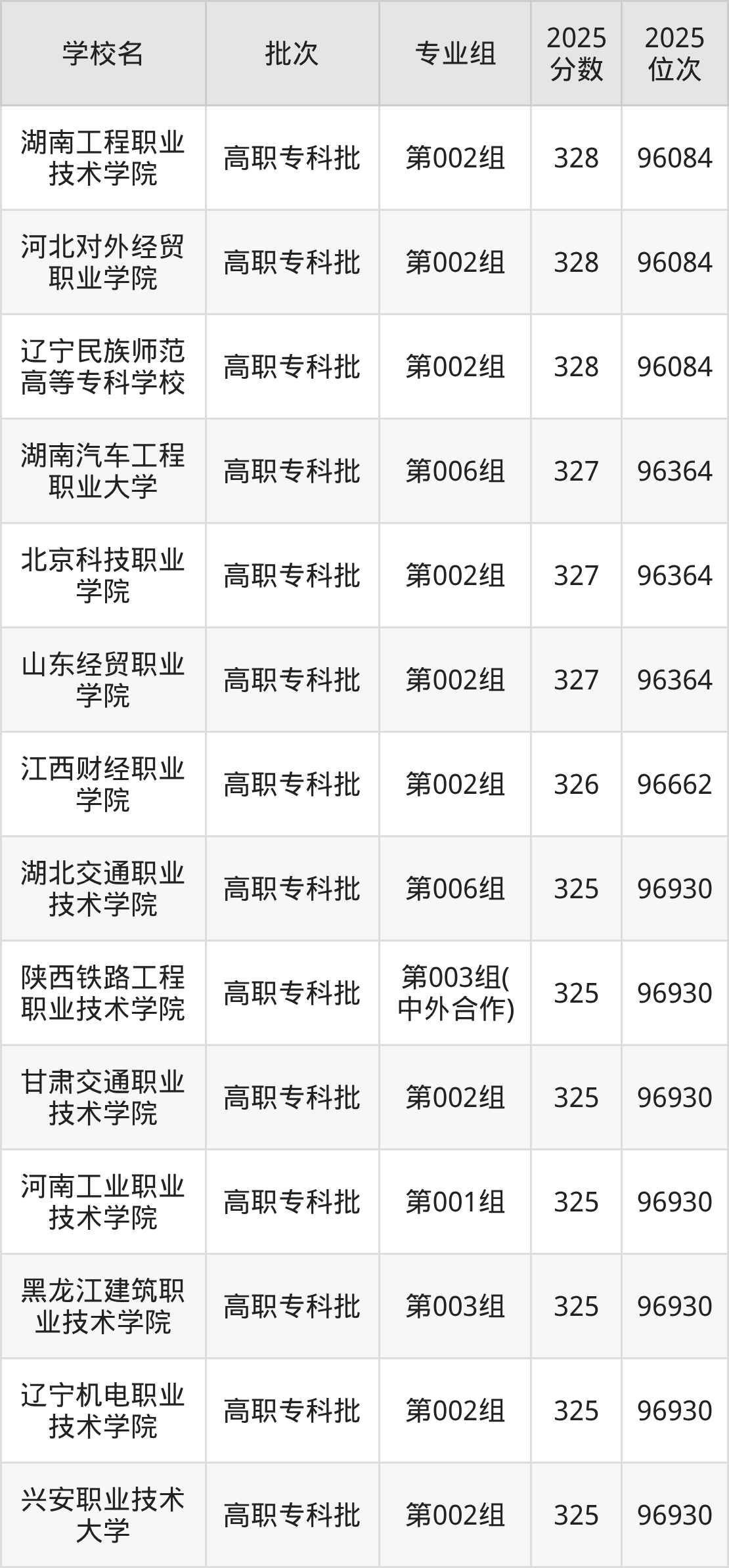 另外录取位次低于该区间(较稳妥)的有甘肃交通职业技术学院第002组(96930名)、陕西铁路工程职业技术学院第003组(中外合作)(96930名)等;录取位次高于该区间(可冲)的有湖南汽车工程职业大学第006组(96364名)、山东经贸职业学院第002组(96364名)等。