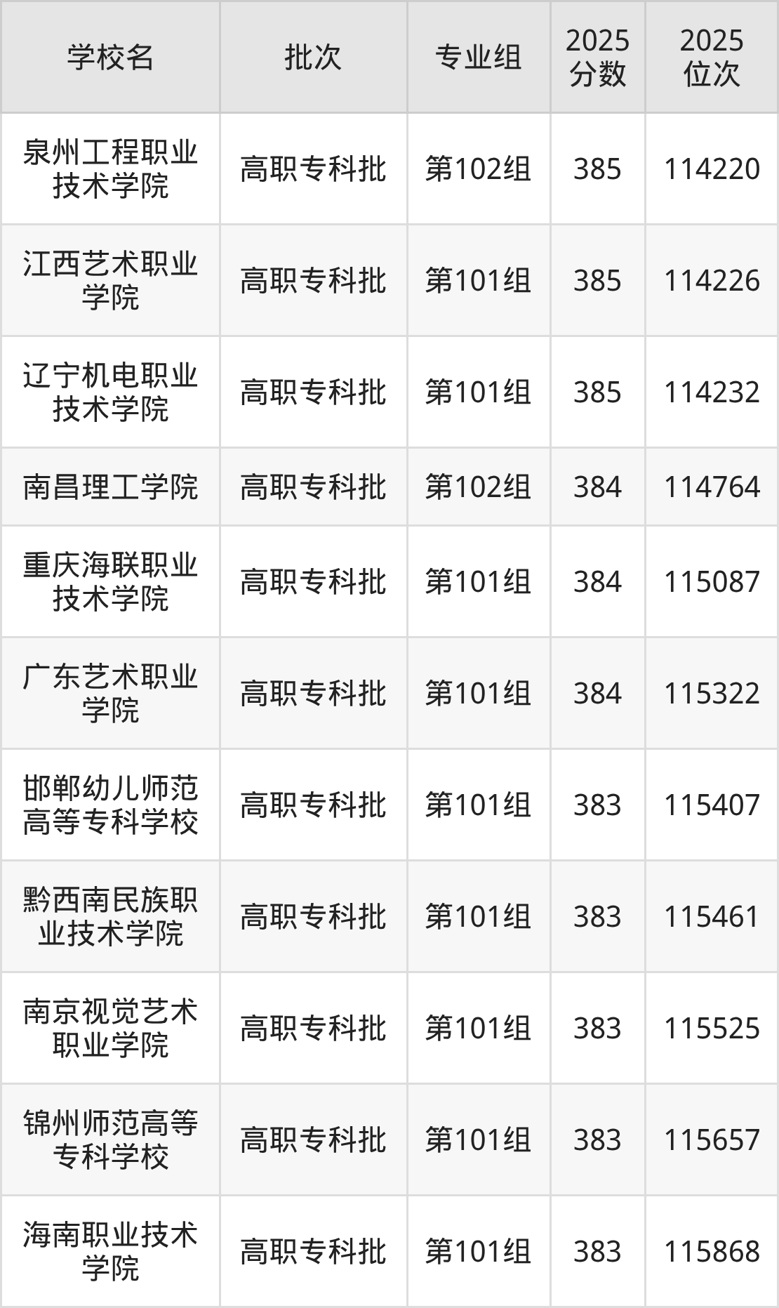 2025年江西高考历史类384分(114700名~115406名)能上的大学有广东艺术职业学院第101组、重庆海联职业技术学院第101组、南昌理工学院第102组。