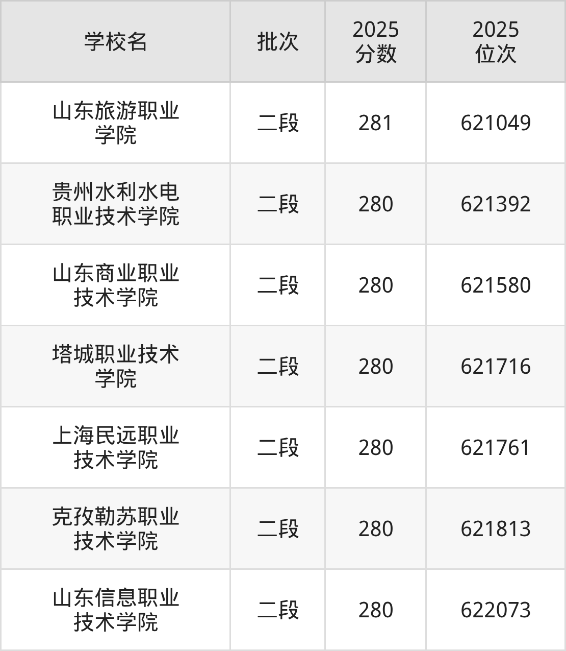 2025年山东高考280分(621074名~622140名)能上的大学有克孜勒苏职业技术学院、山东商业职业技术学院、山东信息职业技术学院、塔城职业技术学院等。
