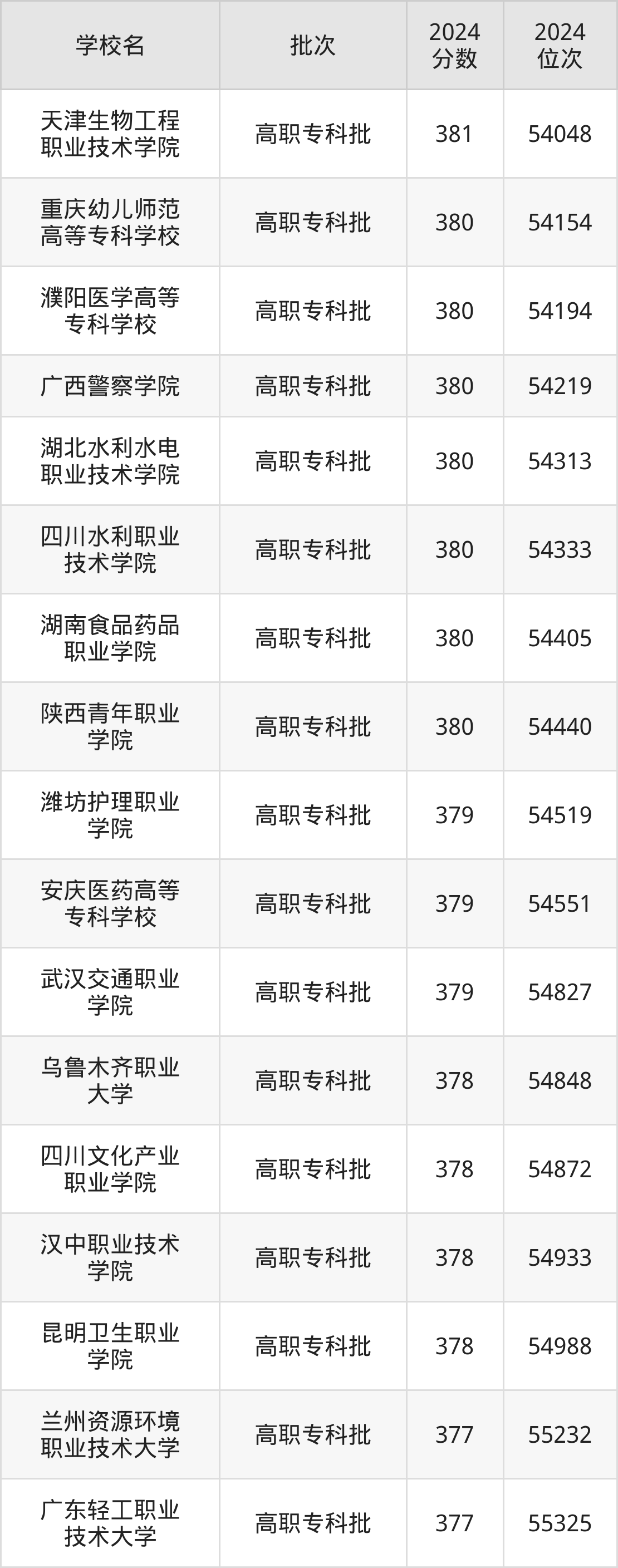 2024年陕西高考文科379分(54454名~54830名)能上的大学有安庆医药高等专科学校、潍坊护理职业学院、武汉交通职业学院。