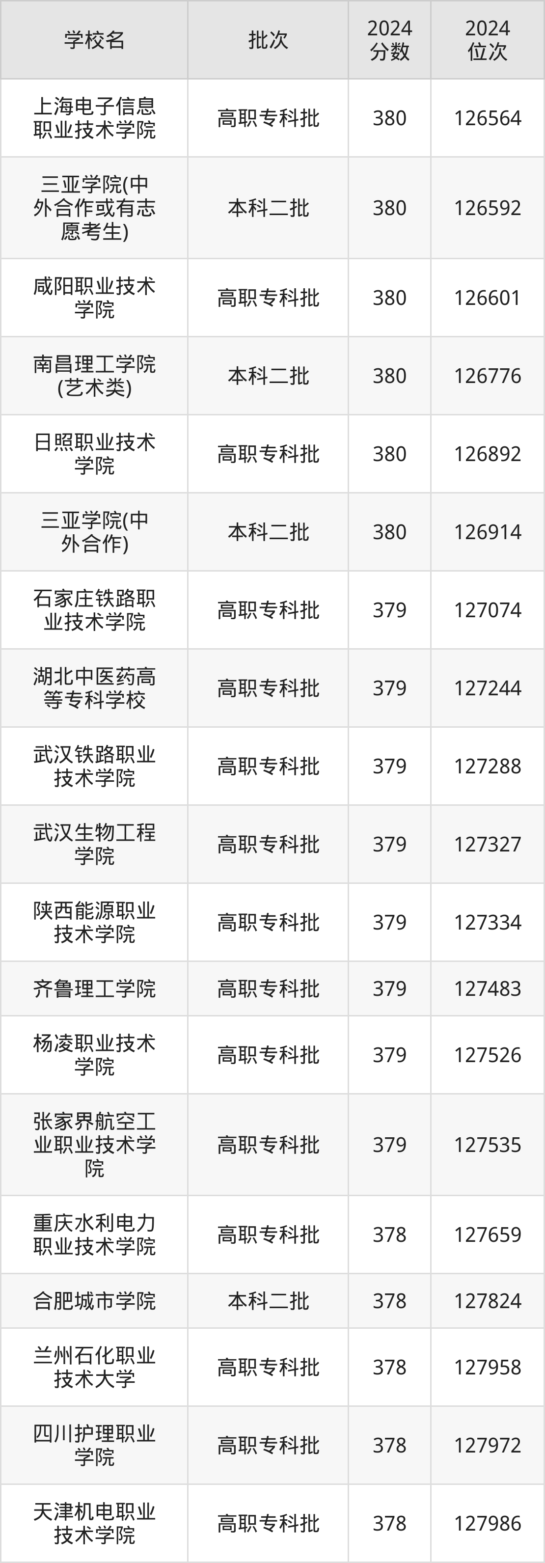 2024年陕西高考理科379分(127046名~127654名)能上的大学有石家庄铁路职业技术学院、齐鲁理工学院、武汉生物工程学院、湖北中医药高等专科学校等。