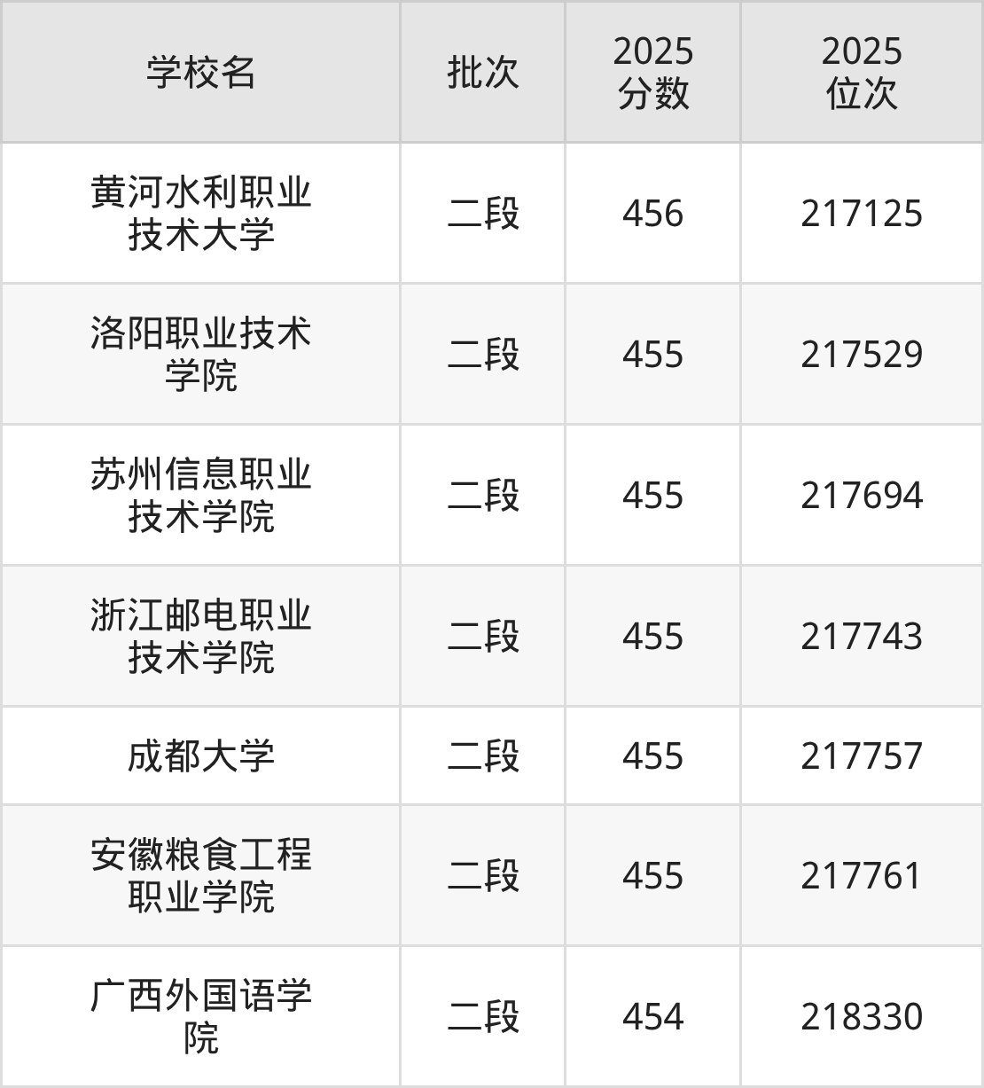 2025年浙江高考455分(217388名~218243名)能上的大学有苏州信息职业技术学院、洛阳职业技术学院、成都大学、浙江邮电职业技术学院等。