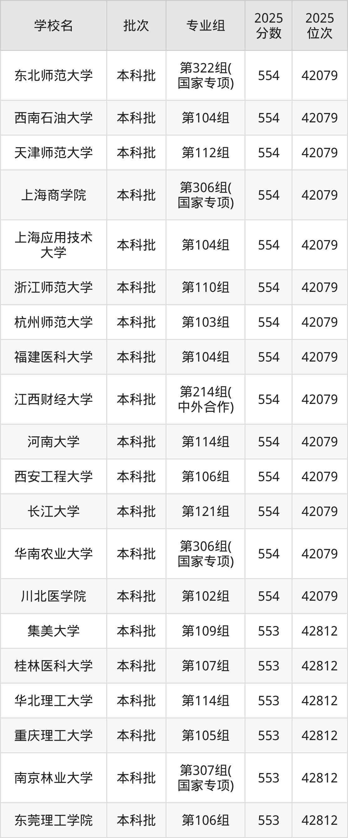 2025年湖南高考物理类553分(42080名~42812名)能上的大学有华北理工大学第114组、哈尔滨医科大学第107组、南京林业大学第307组(国家专项)、南京林业大学第308组(国家专项)等。
