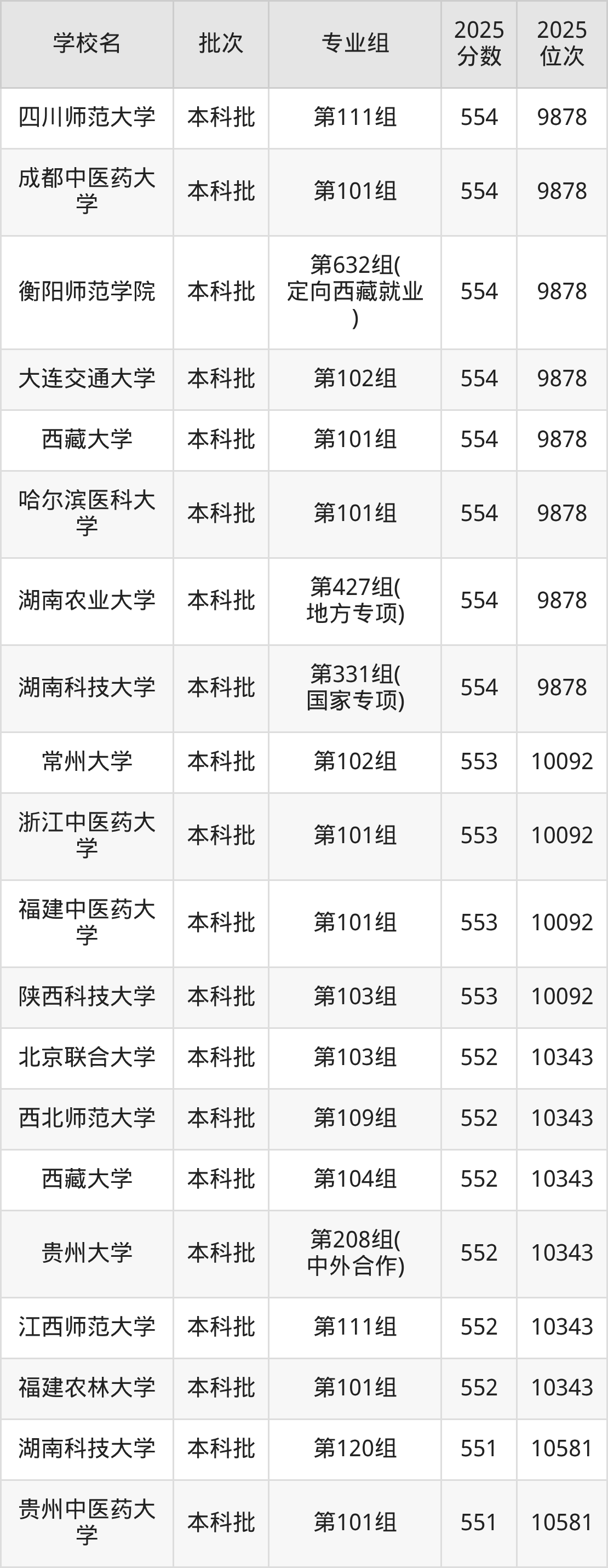 2025年湖南高考历史类553分(9879名~10092名)能上的大学有常州大学第102组、浙江中医药大学第101组、福建中医药大学第101组、陕西科技大学第103组。