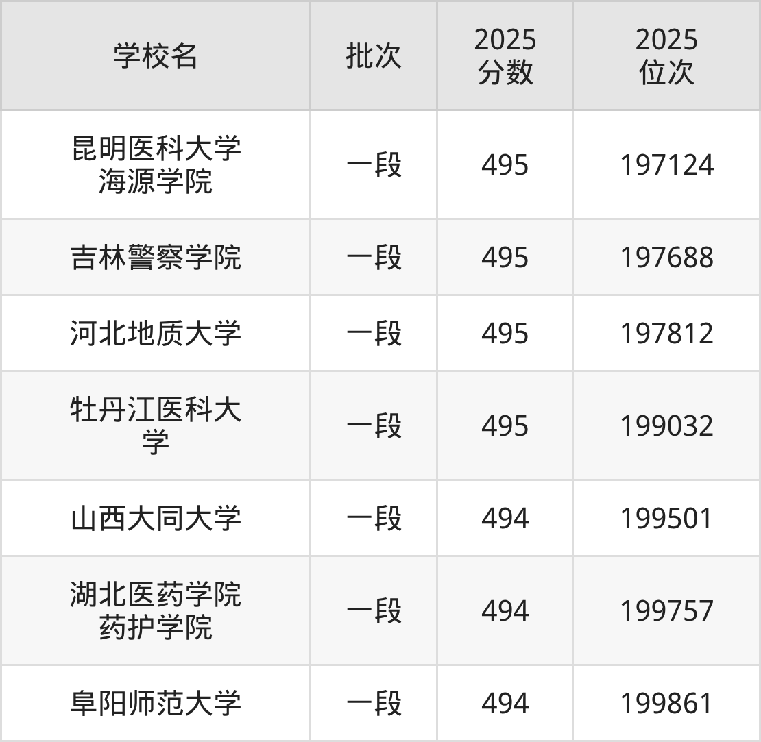 2025年山东高考495分(197004名~199422名)能上的大学有昆明医科大学海源学院、牡丹江医科大学、吉林警察学院、河北地质大学。