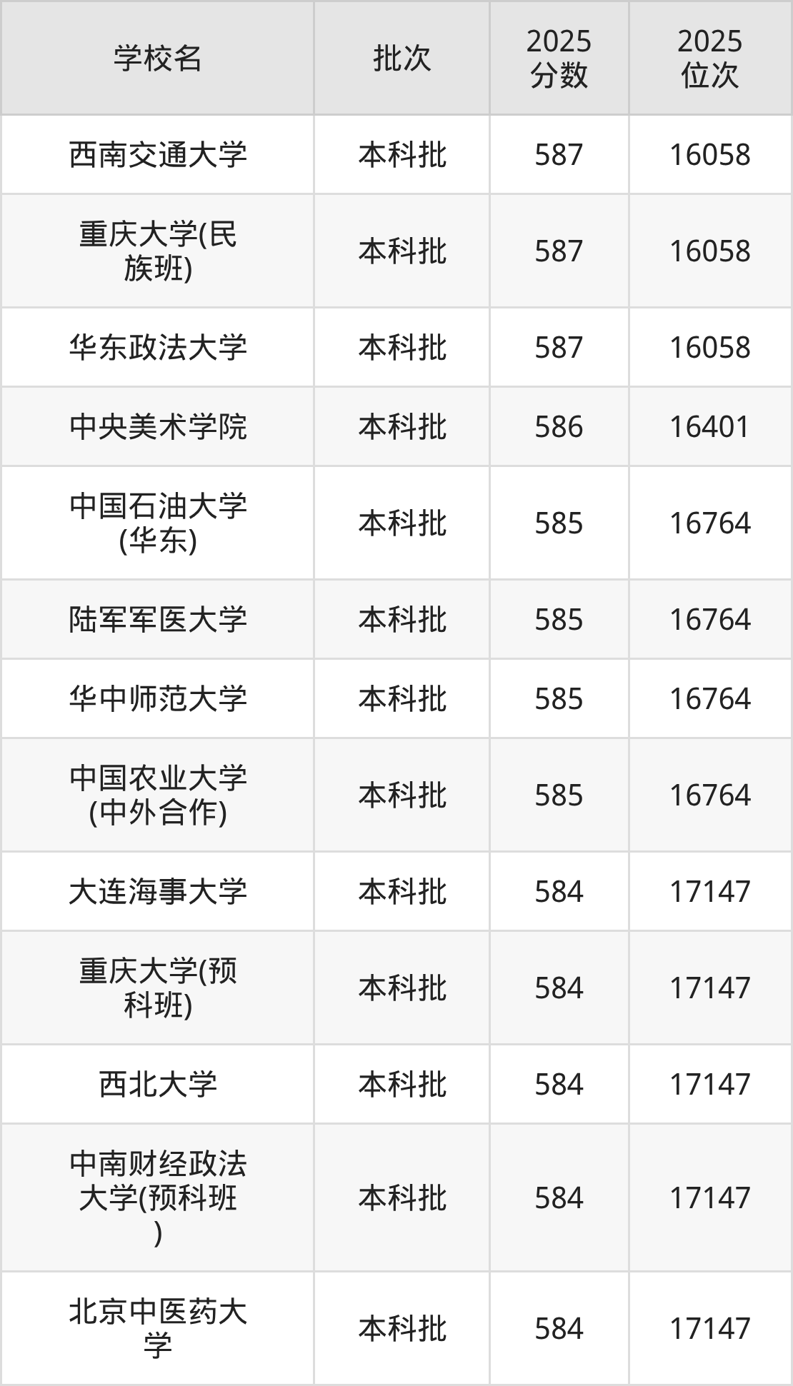 2025年重庆高考物理类585分(16402名~16764名)能上的大学有中国农业大学(中外合作)、华中师范大学、陆军军医大学、中国石油大学(华东)。