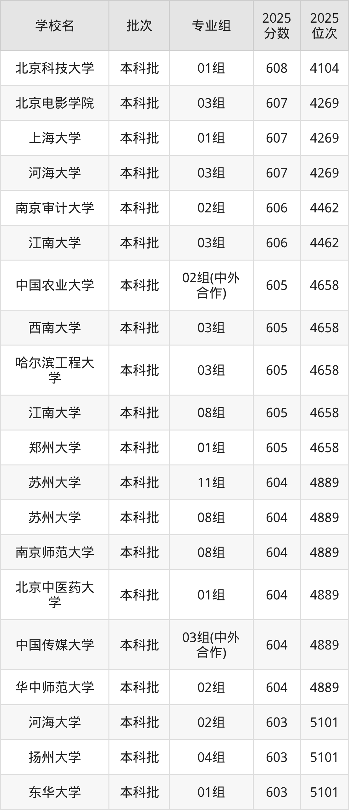2025年江苏高考历史类605分(4463名~4658名)能上的大学有江南大学08组、中国农业大学02组(中外合作)、哈尔滨工程大学03组、郑州大学01组等。