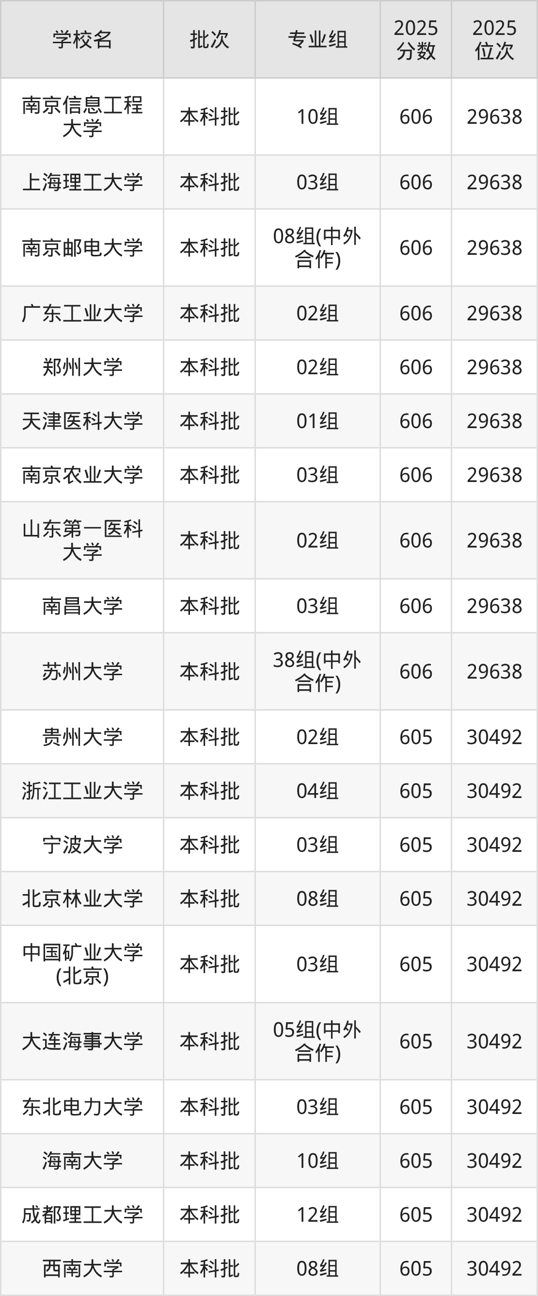 江苏高考605分:历史类排名4658位、物理类排名30492位。该分数位次对应能上的大学历史类有江南大学08组、中国农业大学02组(中外合作);物理类有浙江工业大学04组、宁波大学03组,更多名单如下文所示,2026届考生可参考。