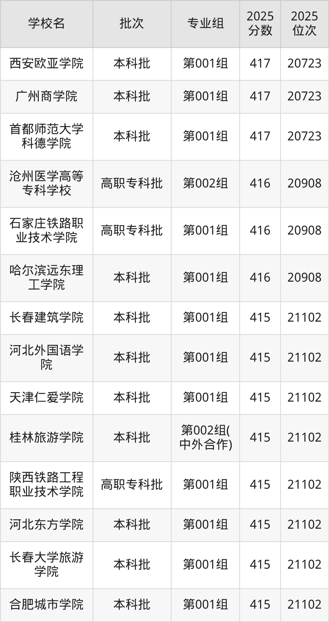 2025年黑龙江高考历史类417分(20537名~20723名)能上的大学有首都师范大学科德学院第001组、广州商学院第001组、西安欧亚学院第001组、长沙民政职业技术学院第001组。