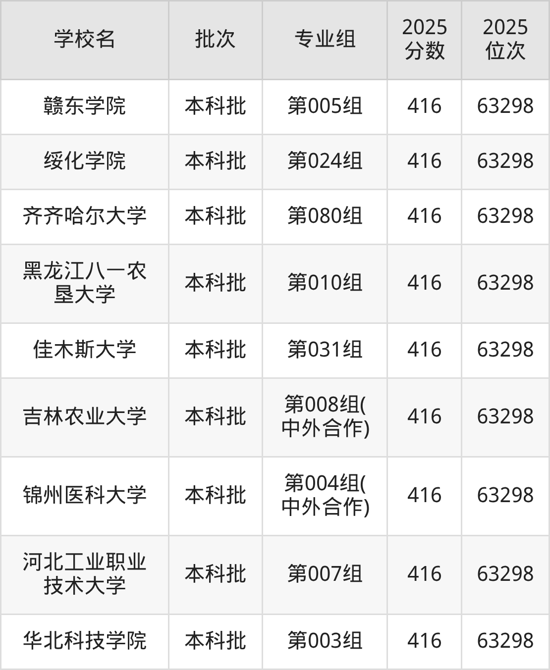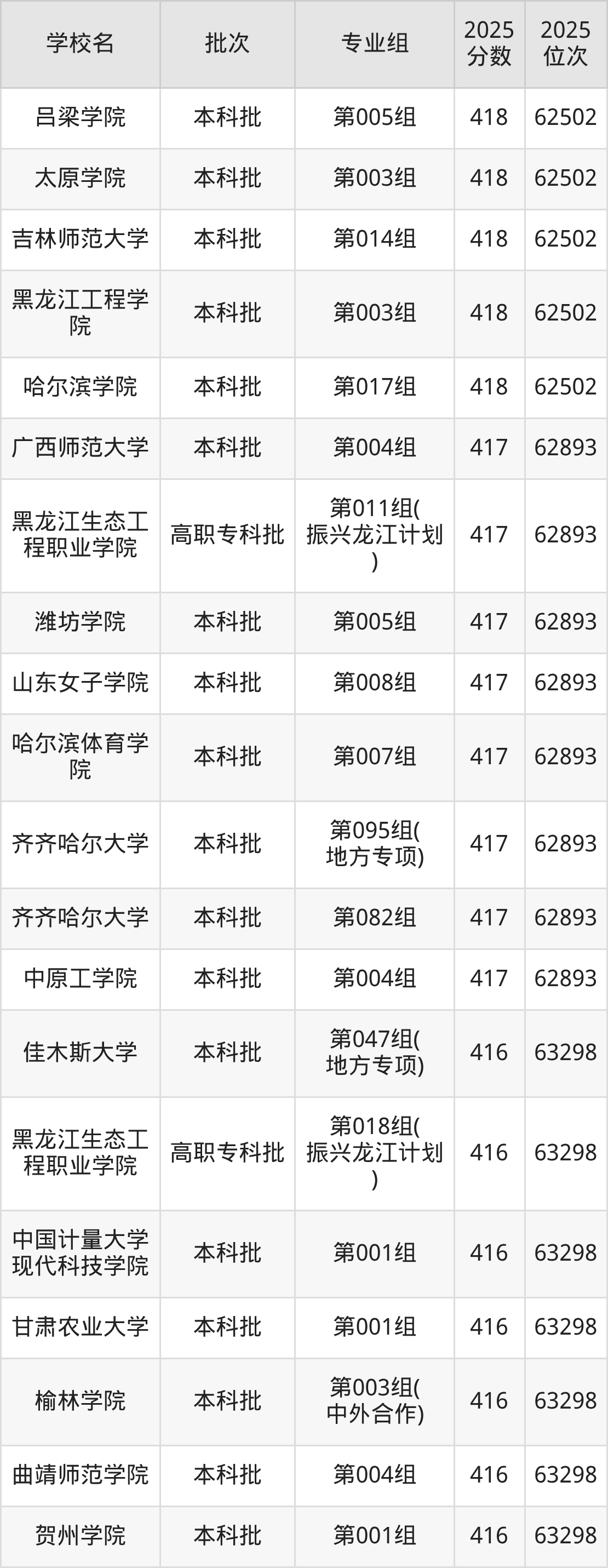 2025年黑龙江高考物理类417分(62503名~62893名)能上的大学有齐齐哈尔大学第082组、齐齐哈尔大学第095组(地方专项)、哈尔滨体育学院第007组、潍坊学院第005组等。