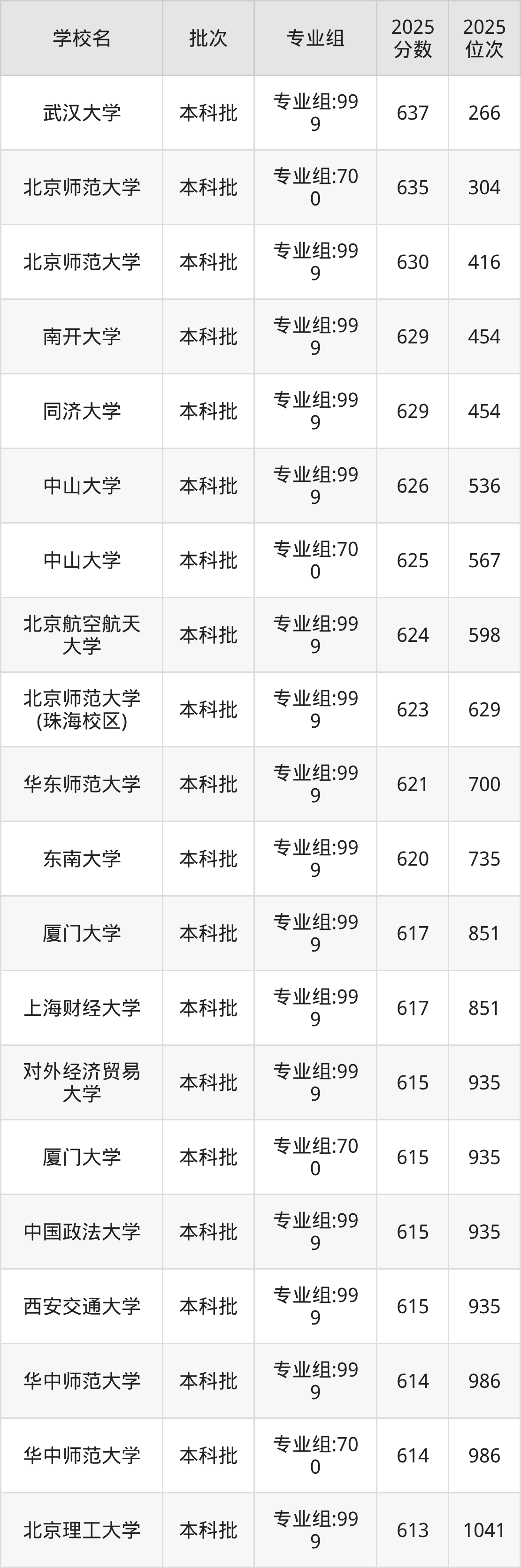 2025年福建高考历史类619分(736名~769名)录取位次低于该区间(较稳妥)的有上海财经大学专业组:999(851名)、厦门大学专业组:999(851名)等;录取位次高于该区间(可冲)的有东南大学专业组:999(735名)、华东师范大学专业组:999(700名)等。