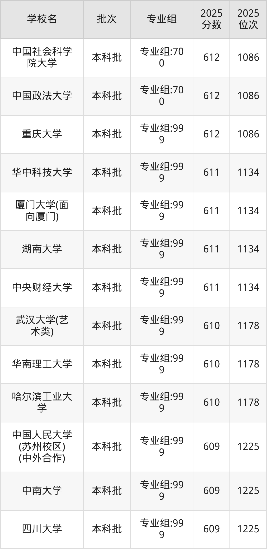 由于高考录取分数线历年波动较大,因此本文以该分数对应的位次排名为大家整理能上的大学名单。