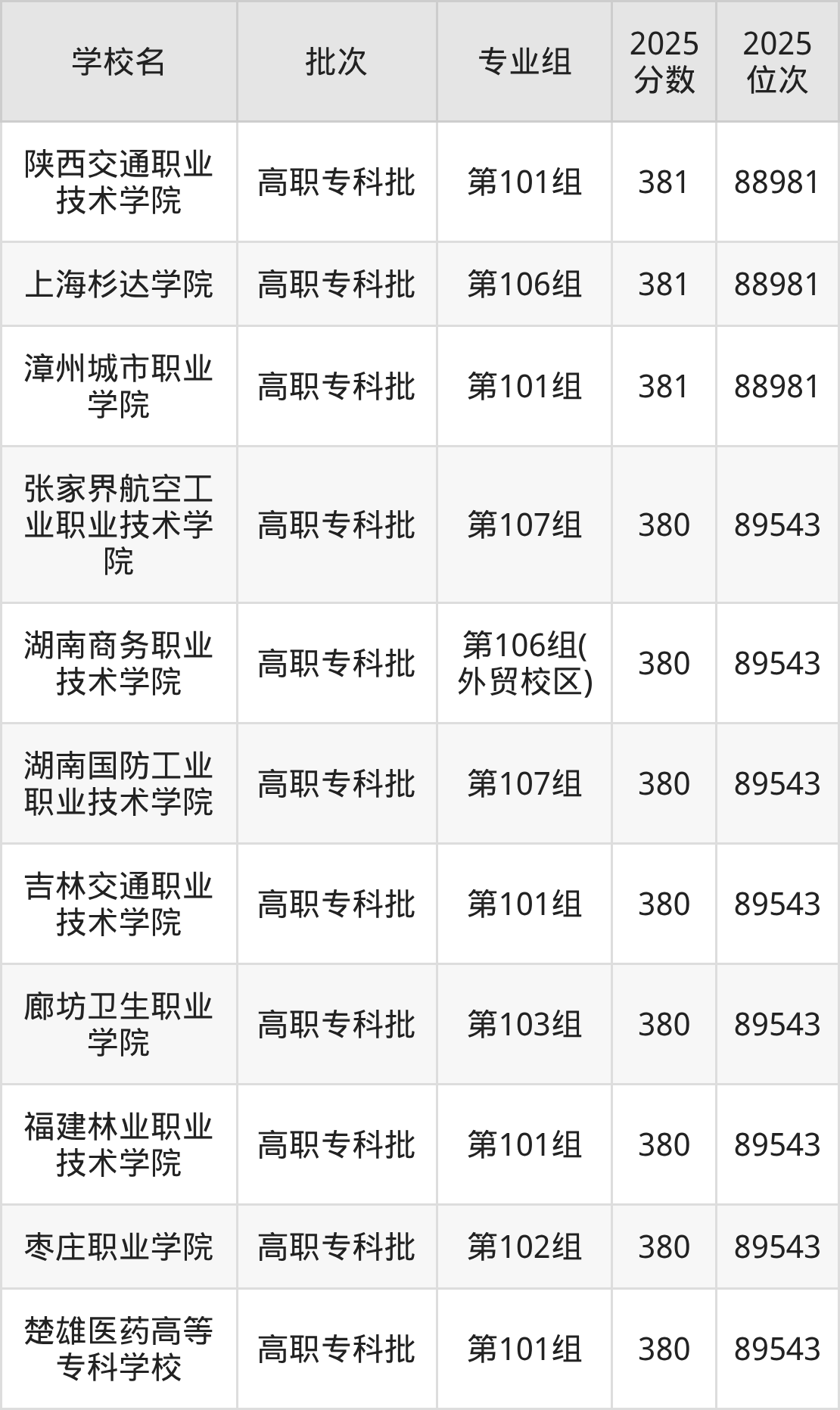 2025年湖南高考历史类380分(88982名~89543名)能上的大学有吉林交通职业技术学院第101组、廊坊卫生职业学院第103组、福建林业职业技术学院第101组、枣庄职业学院第102组等。