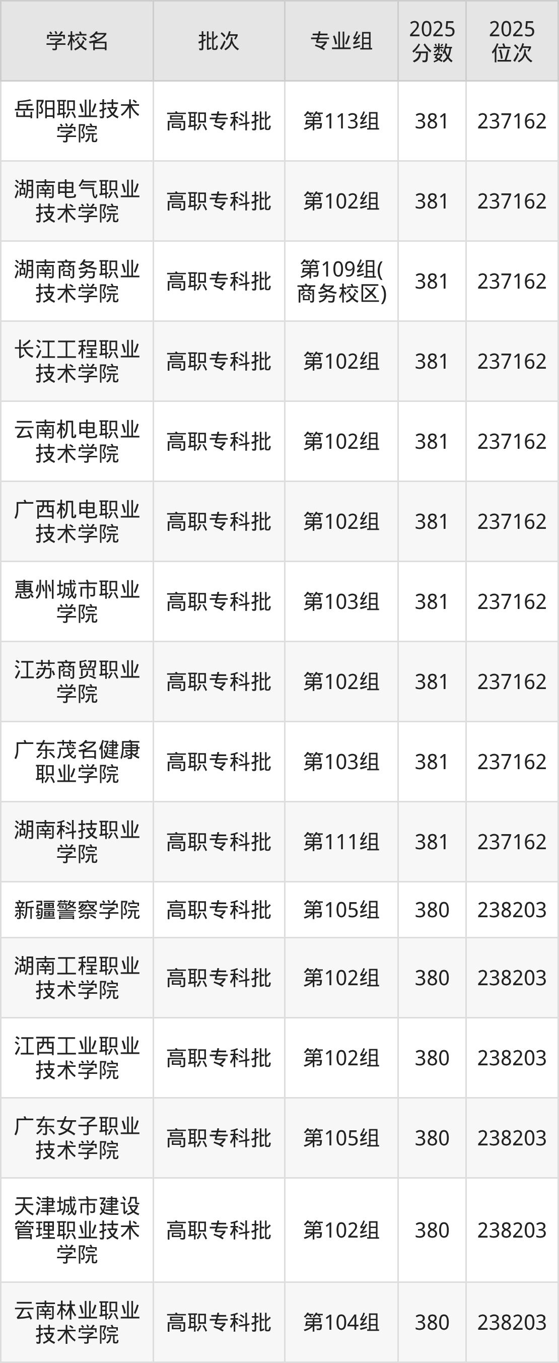 2025年湖南高考物理类380分(237163名~238203名)能上的大学有天津城市建设管理职业技术学院第102组、江西工业职业技术学院第102组、湖南工程职业技术学院第102组、广东女子职业技术学院第105组等。