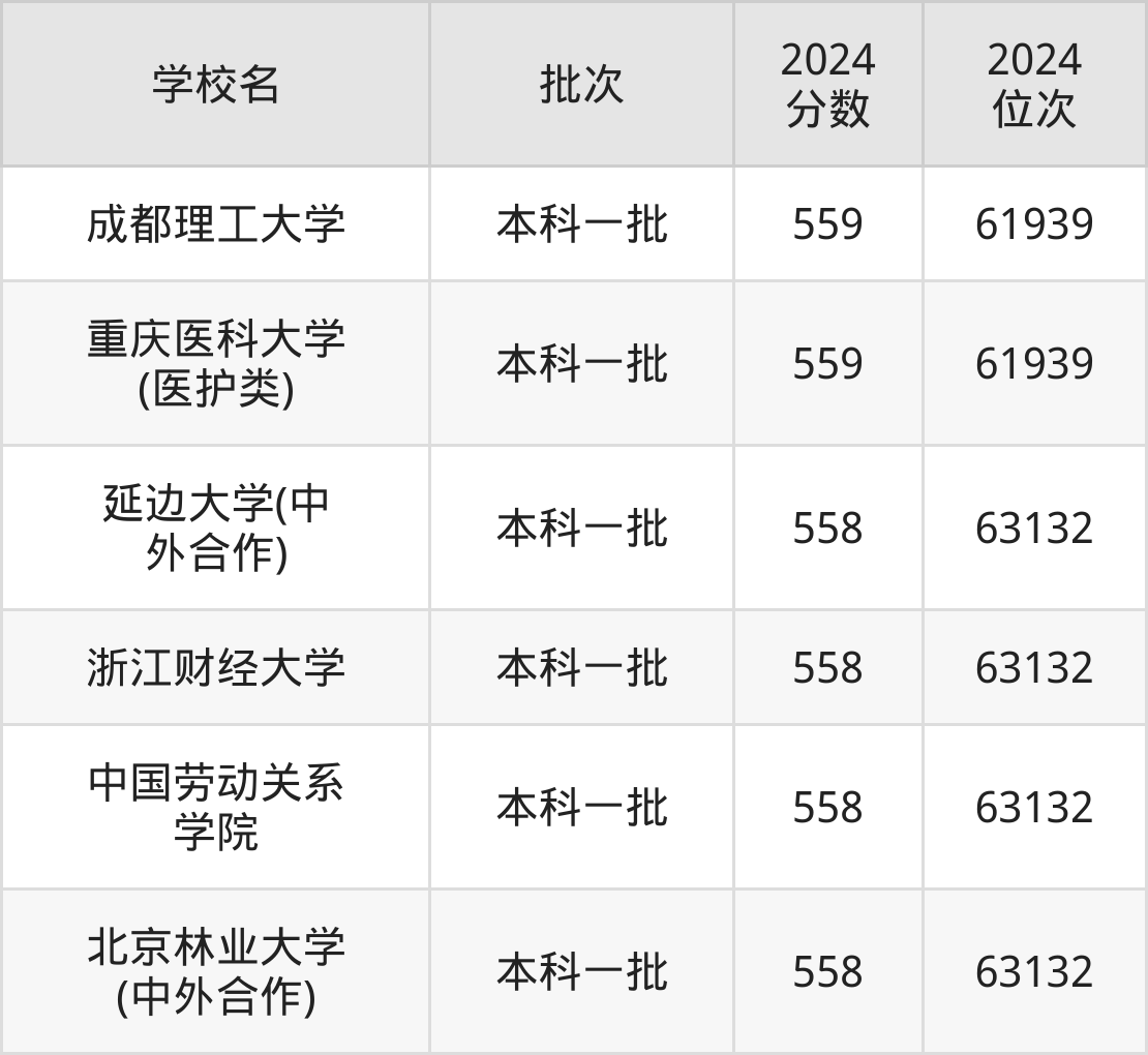 2024年河南高考理科558分(61940名~63132名)能上的大学有浙江财经大学、中国劳动关系学院、北京林业大学(中外合作)、延边大学(中外合作)。