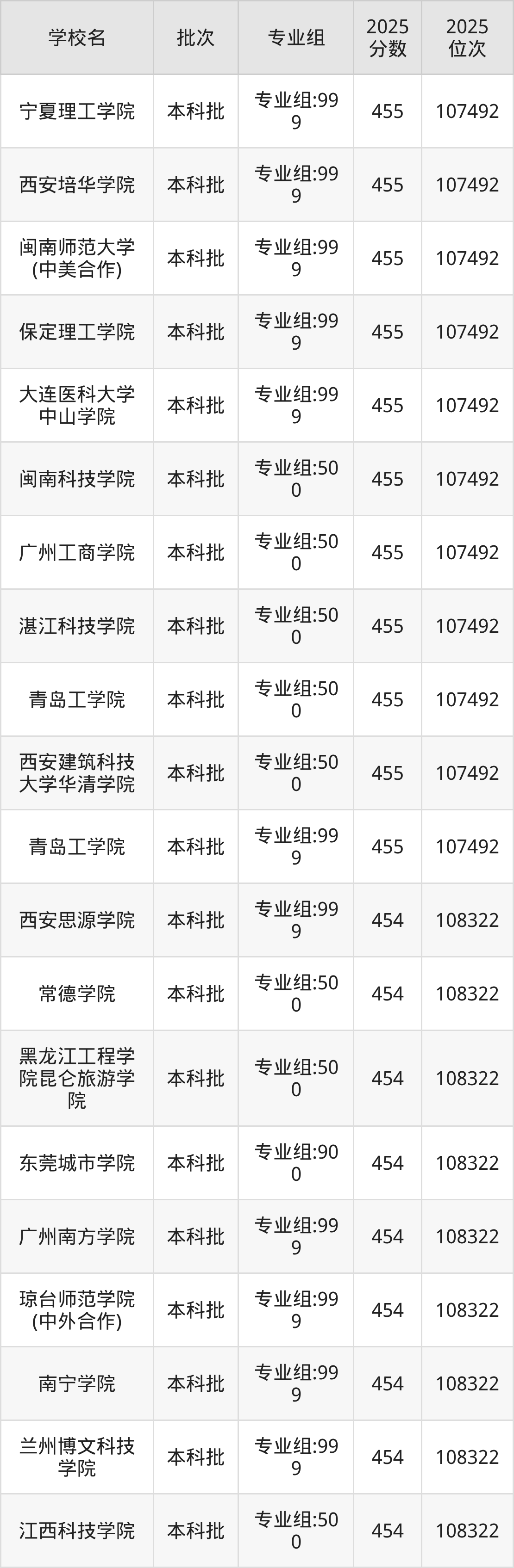 2025年福建高考物理类454分(107493名~108322名)能上的大学有常德学院专业组:500、东莞城市学院专业组:900、广州南方学院专业组:999、黑龙江工程学院昆仑旅游学院专业组:500等。