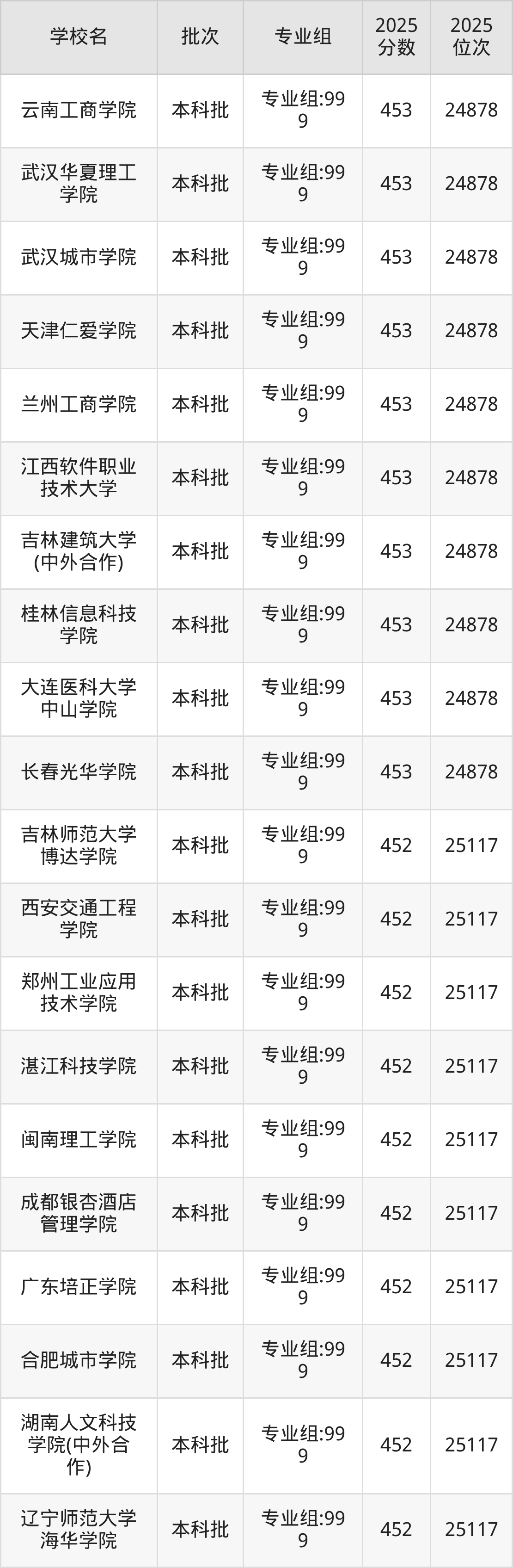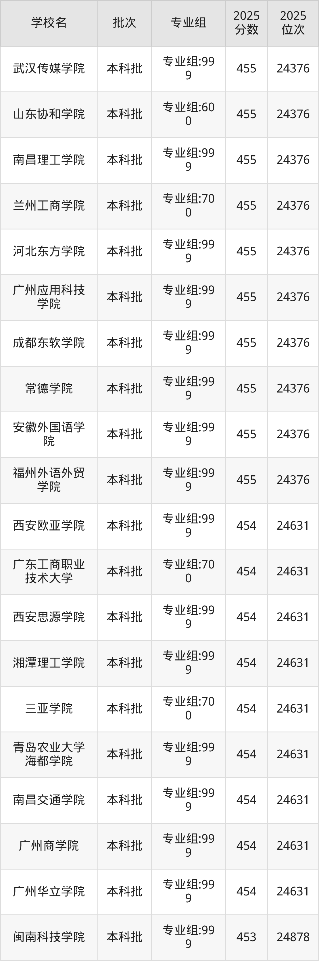 2025年福建高考历史类454分(24377名~24631名)能上的大学有广东工商职业技术大学专业组:700、广州华立学院专业组:999、广州商学院专业组:999、南昌交通学院专业组:999等。