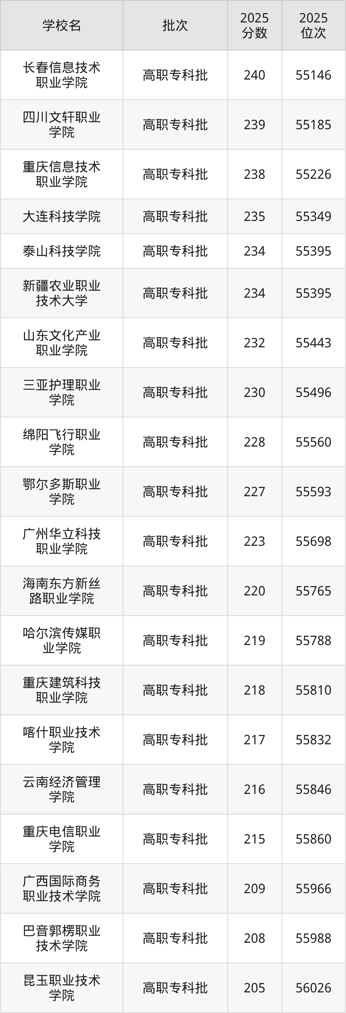 2025年辽宁高考历史类224分(55646名~55668名)录取位次低于该区间(较稳妥)的有广州华立科技职业学院(55698名)、海南东方新丝路职业学院(55765名)等;录取位次高于该区间(可冲)的有鄂尔多斯职业学院(55593名)、绵阳飞行职业学院(55560名)等。