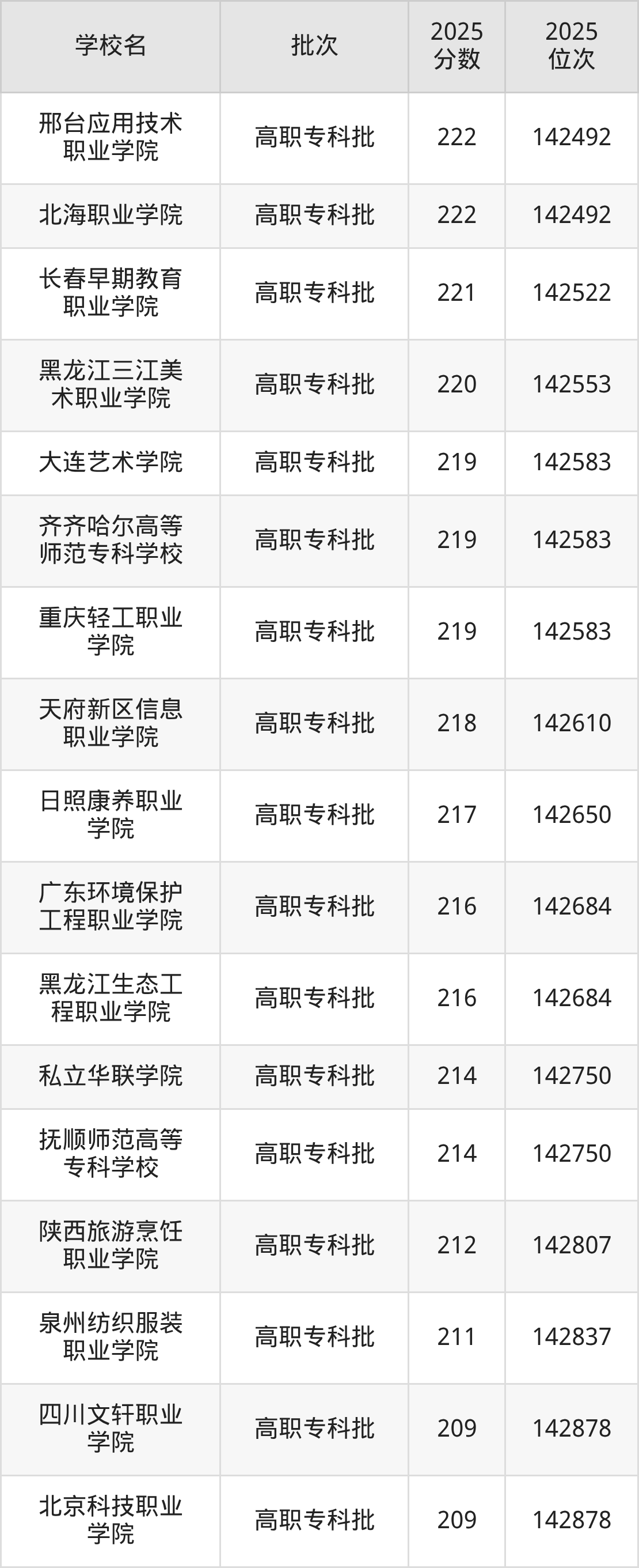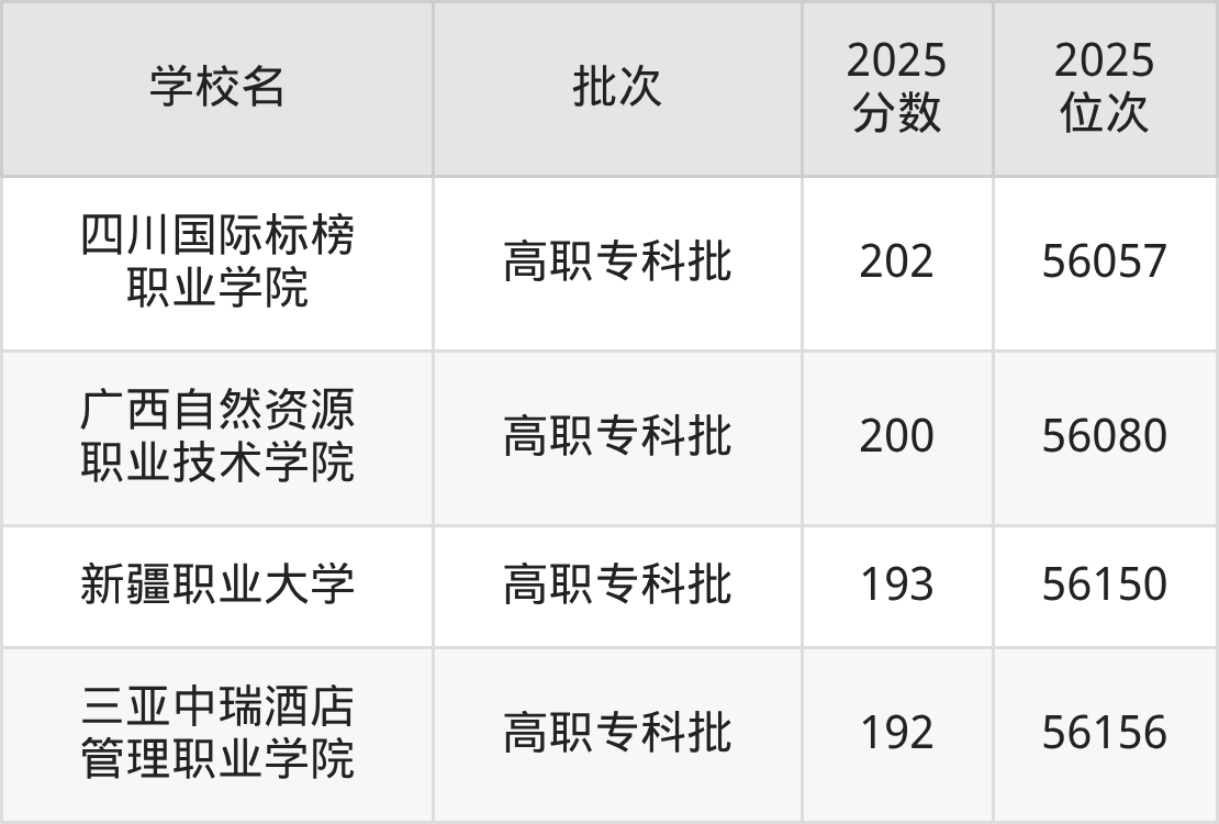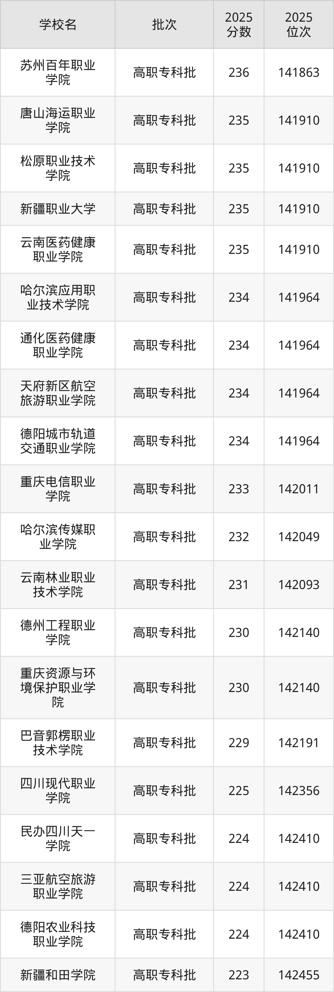 另外录取位次低于该区间(较稳妥)的有新疆和田学院(142455名)、北海职业学院(142492名)等;录取位次高于该区间(可冲)的有四川现代职业学院(142356名)、巴音郭楞职业技术学院(142191名)等。
