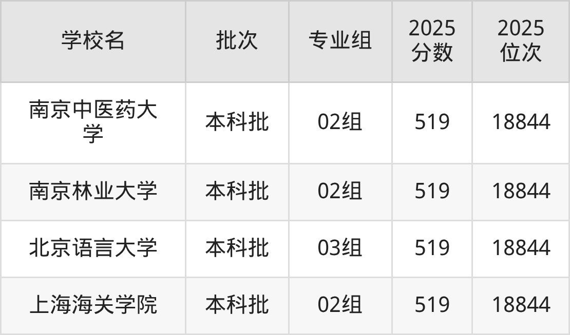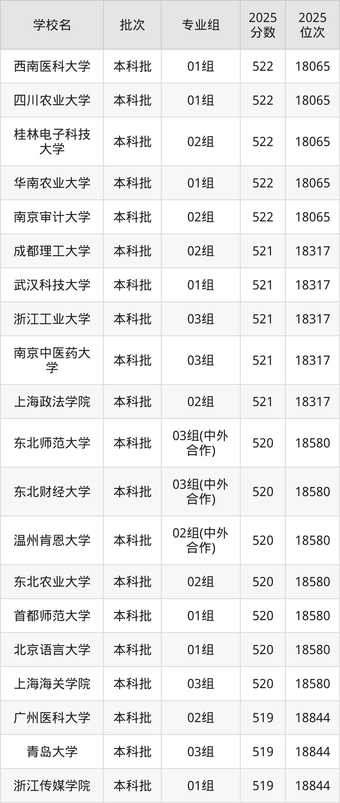 2025年上海高考520分(18318名~18580名)能上的大学有上海海关学院03组、北京语言大学01组、首都师范大学01组、东北农业大学02组等。