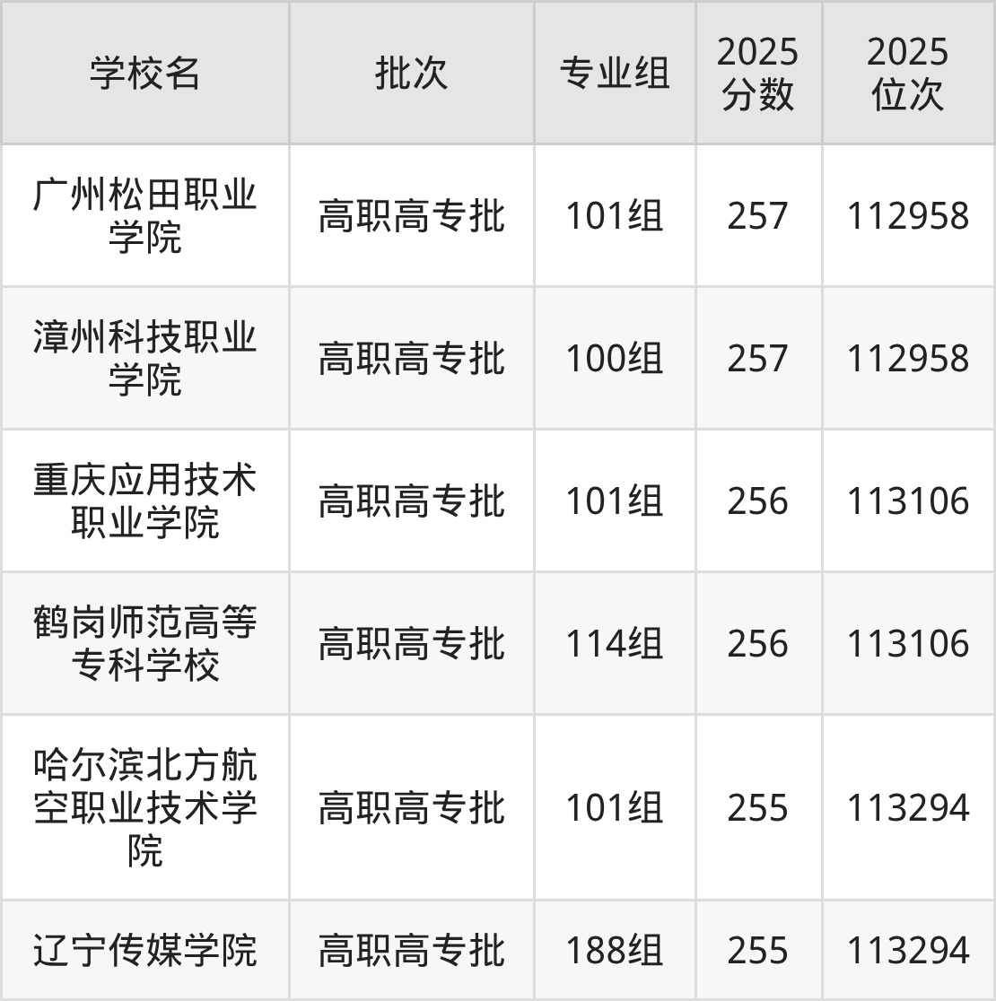 2025年广西高考历史类255分(113107名~113294名)能上的大学有辽宁传媒学院188组、哈尔滨北方航空职业技术学院101组。
