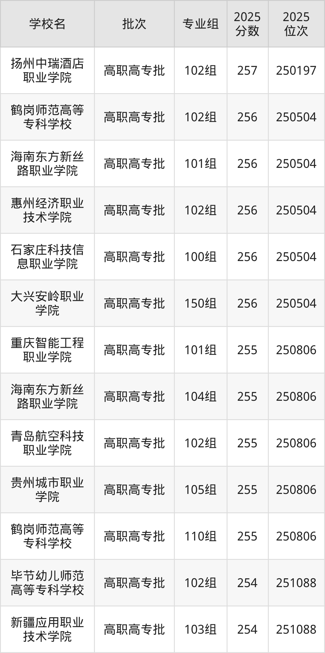 另外录取位次低于该区间(较稳妥)的有毕节幼儿师范高等专科学校102组(251088名)、新疆应用职业技术学院103组(251088名)等;录取位次高于该区间(可冲)的有鹤岗师范高等专科学校102组(250504名)、大兴安岭职业学院150组(250504名)等。