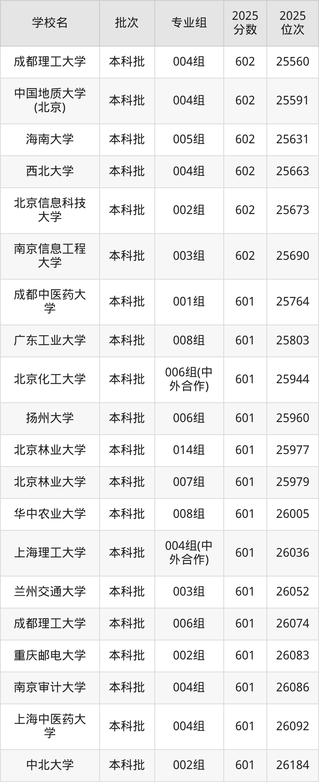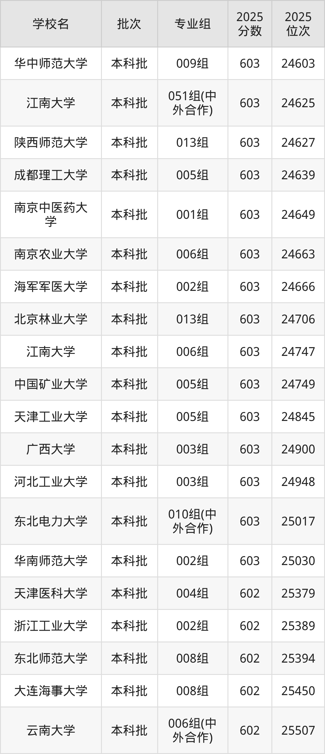 2025年安徽高考物理类602分(25102名~25742名)能上的大学有北京信息科技大学002组、成都理工大学004组、大连海事大学008组、东北师范大学008组等。