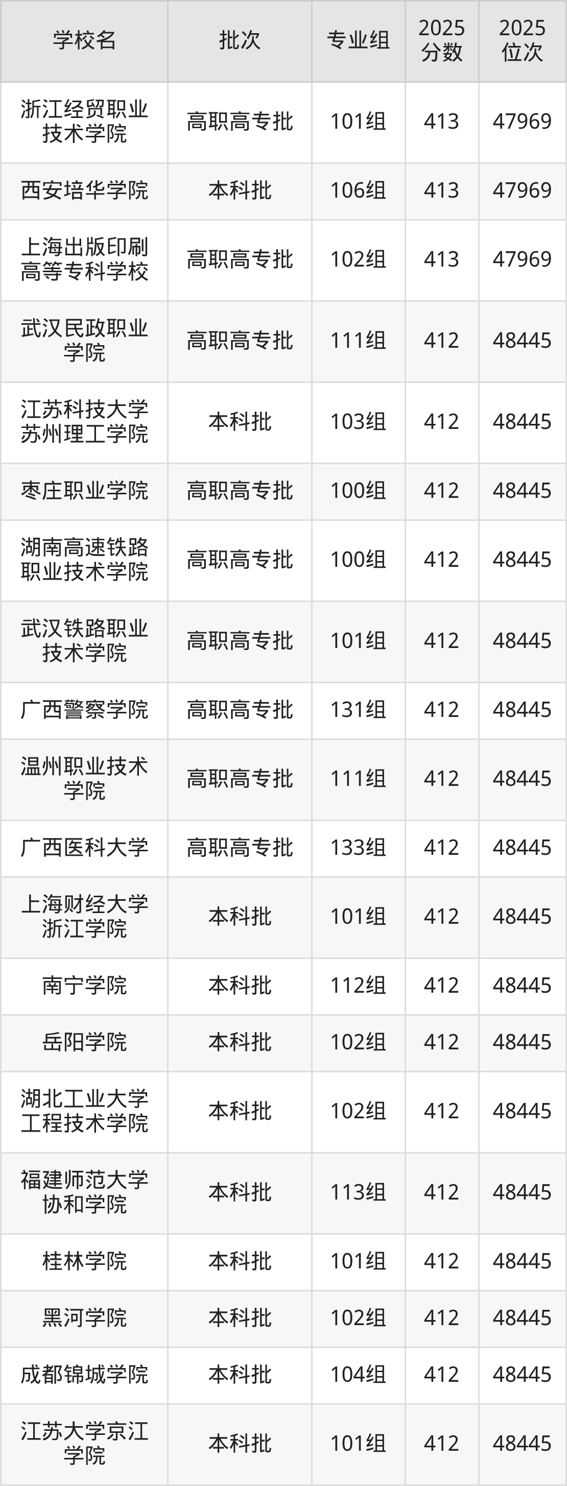 2025年广西高考历史类413分(47512名~47969名)能上的大学有西安培华学院106组、荆州学院101组、河北外国语学院101组、上海出版印刷高等专科学校102组等。