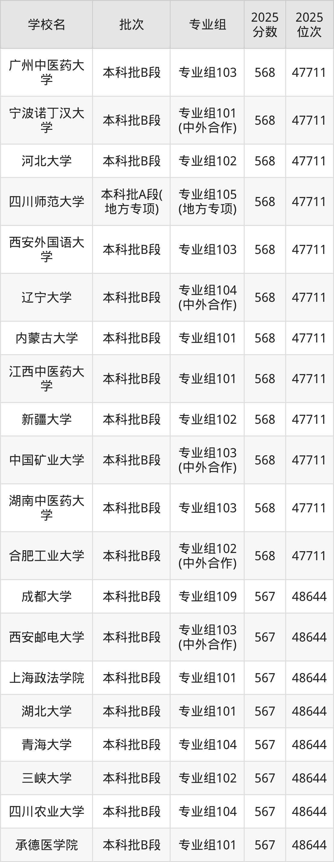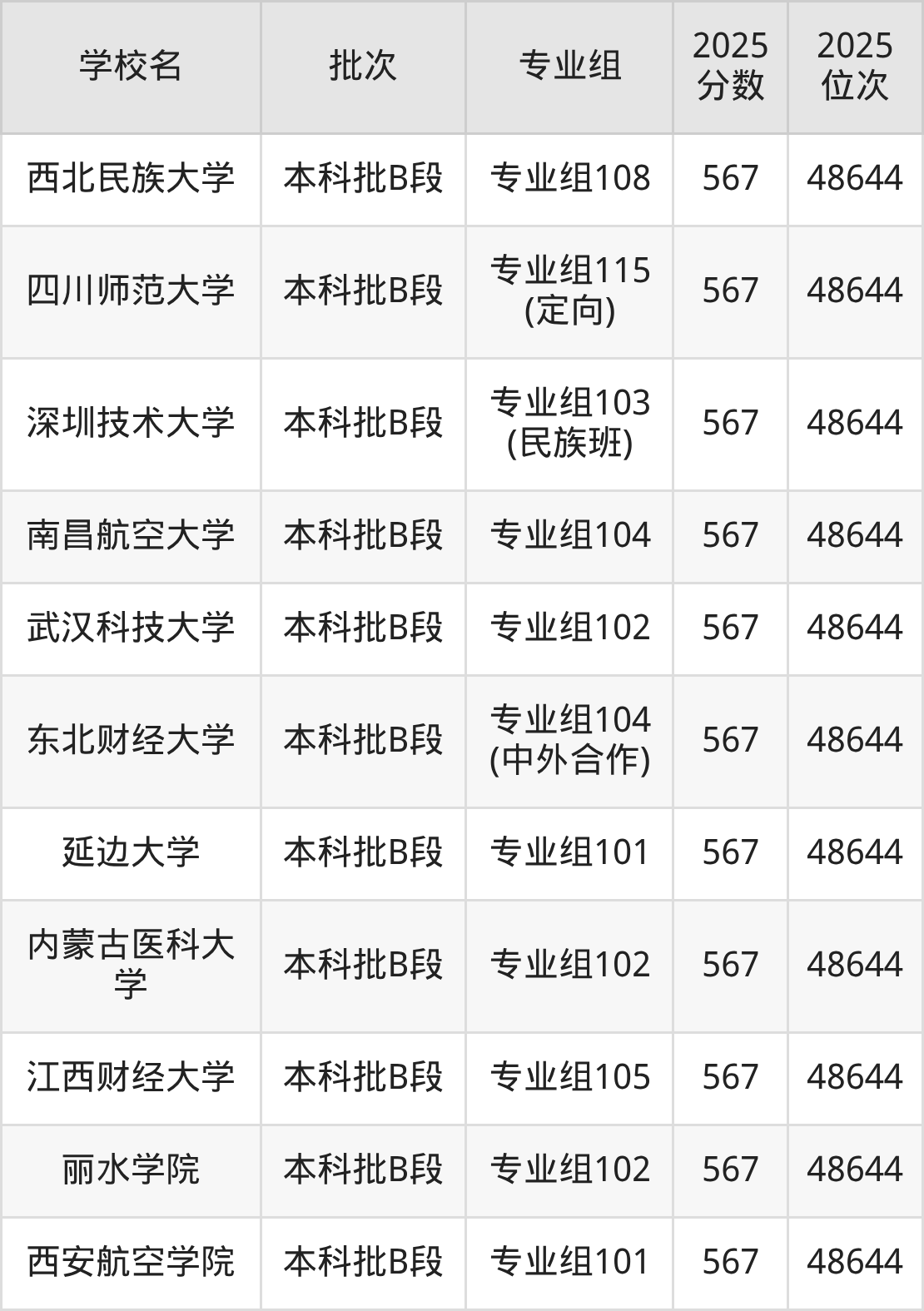 2025年四川高考物理类567分(47712名~48644名)能上的大学有四川农业大学专业组104、承德医学院专业组101、西北民族大学专业组108、四川师范大学专业组115(定向)等。