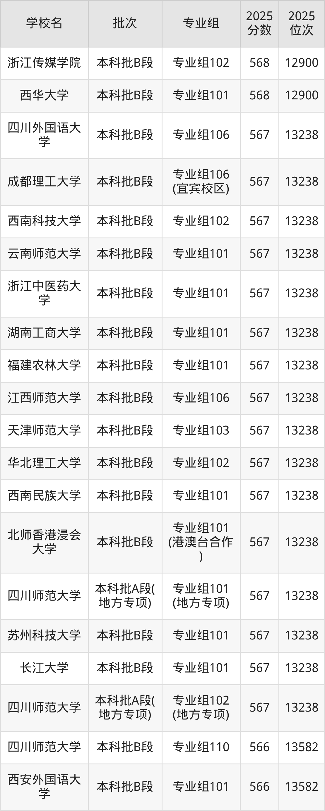 四川高考567分:历史类排名13238位、物理类排名48644位。该分数位次对应能上的大学历史类有四川师范大学专业组102(地方专项)、长江大学专业组101;物理类有四川农业大学专业组104、承德医学院专业组101,更多名单如下文所示,2026届考生可参考。