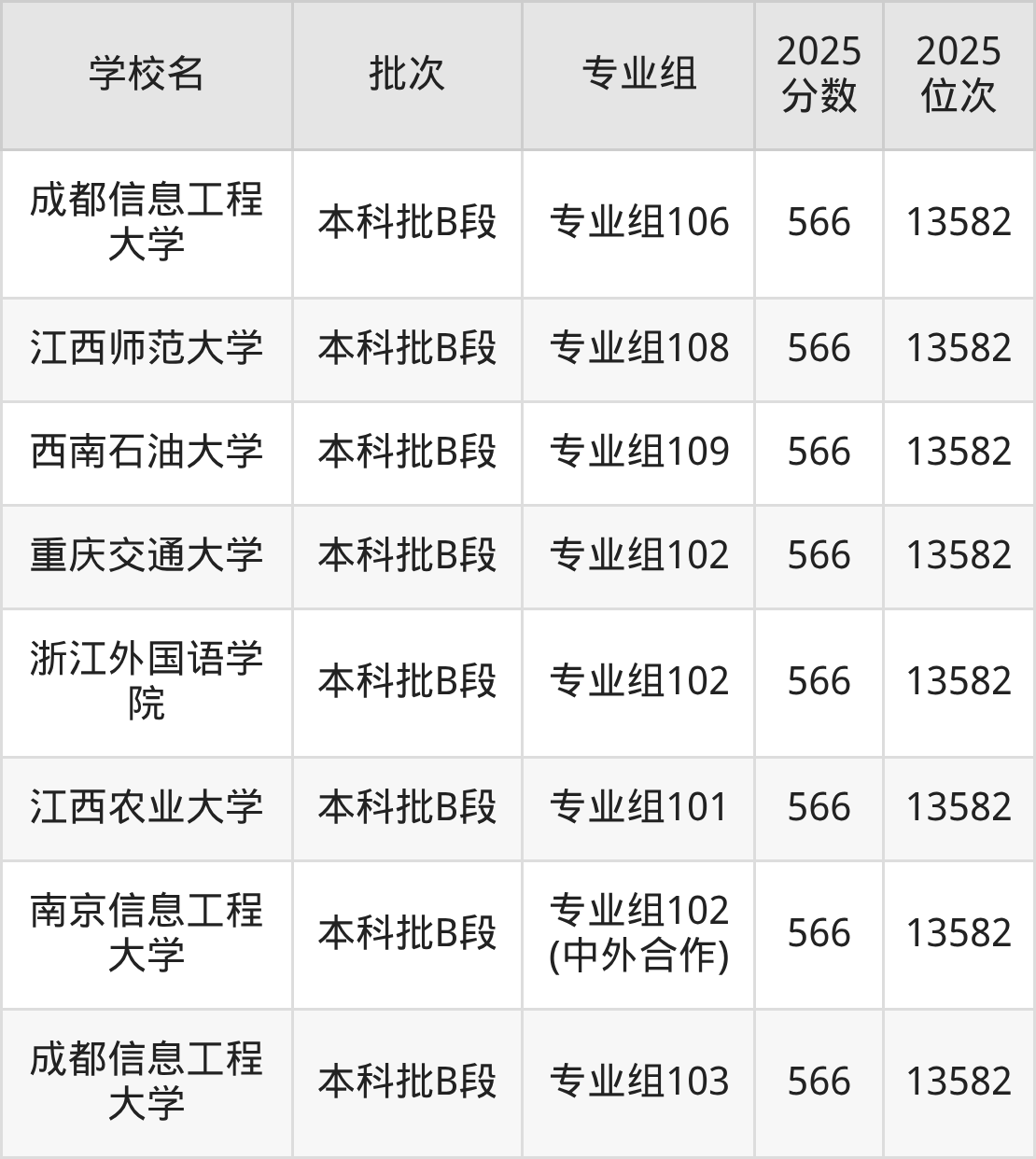 另外录取位次低于该区间(较稳妥)的有南京信息工程大学专业组102(中外合作)(13582名)、西安外国语大学专业组101(13582名)等;录取位次高于该区间(可冲)的有浙江传媒学院专业组102(12900名)、山东师范大学专业组103(12900名)等。