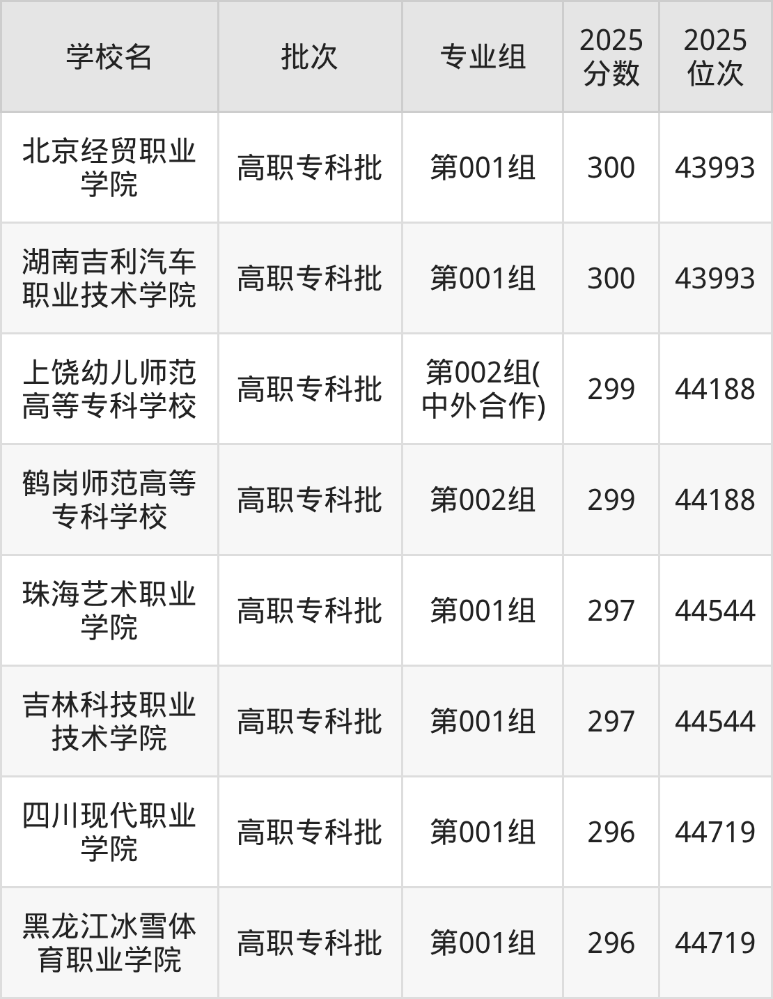 2025年黑龙江高考历史类297分(44377名~44544名)能上的大学有吉林科技职业技术学院第001组、珠海艺术职业学院第001组。
