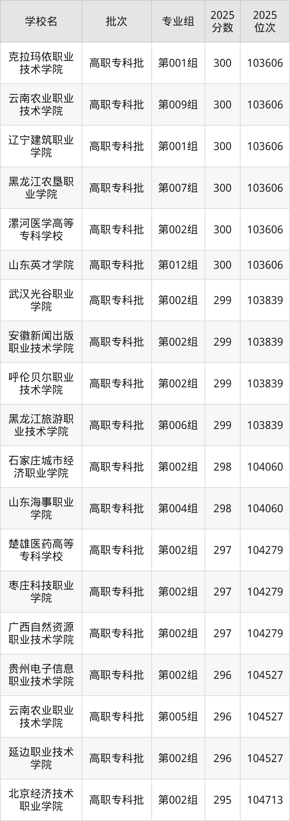 2025年黑龙江高考物理类297分(104061名~104279名)能上的大学有枣庄科技职业学院第002组、广西自然资源职业技术学院第002组、楚雄医药高等专科学校第002组。