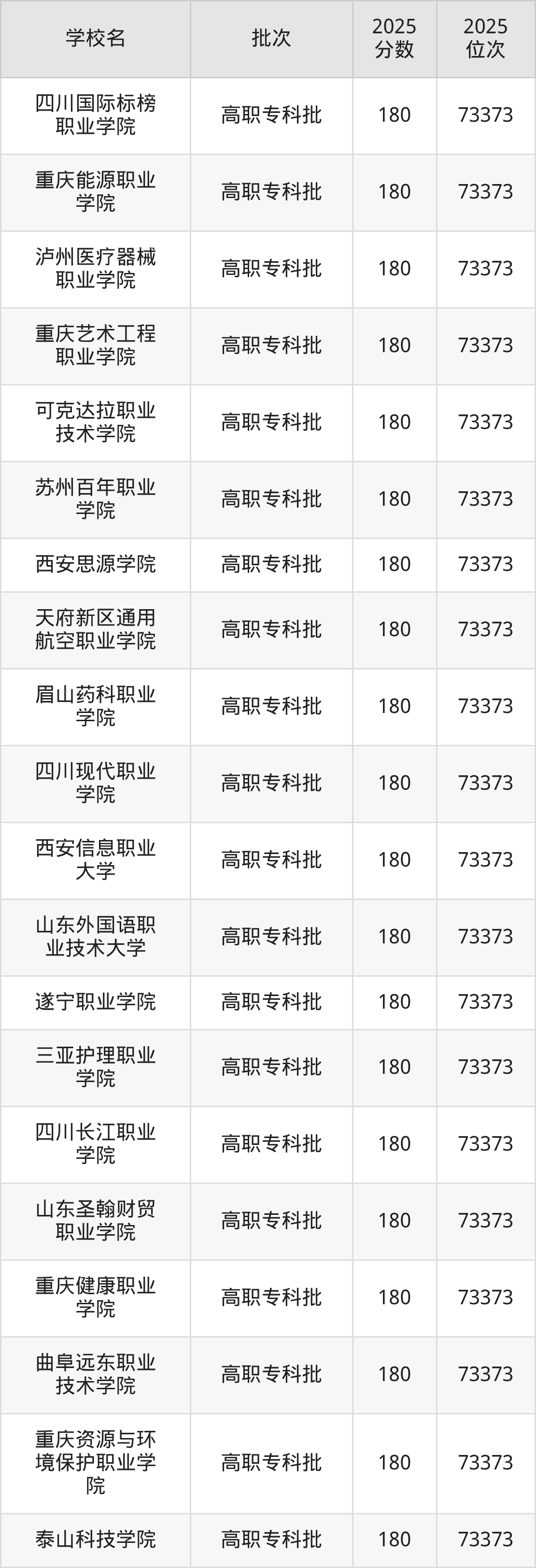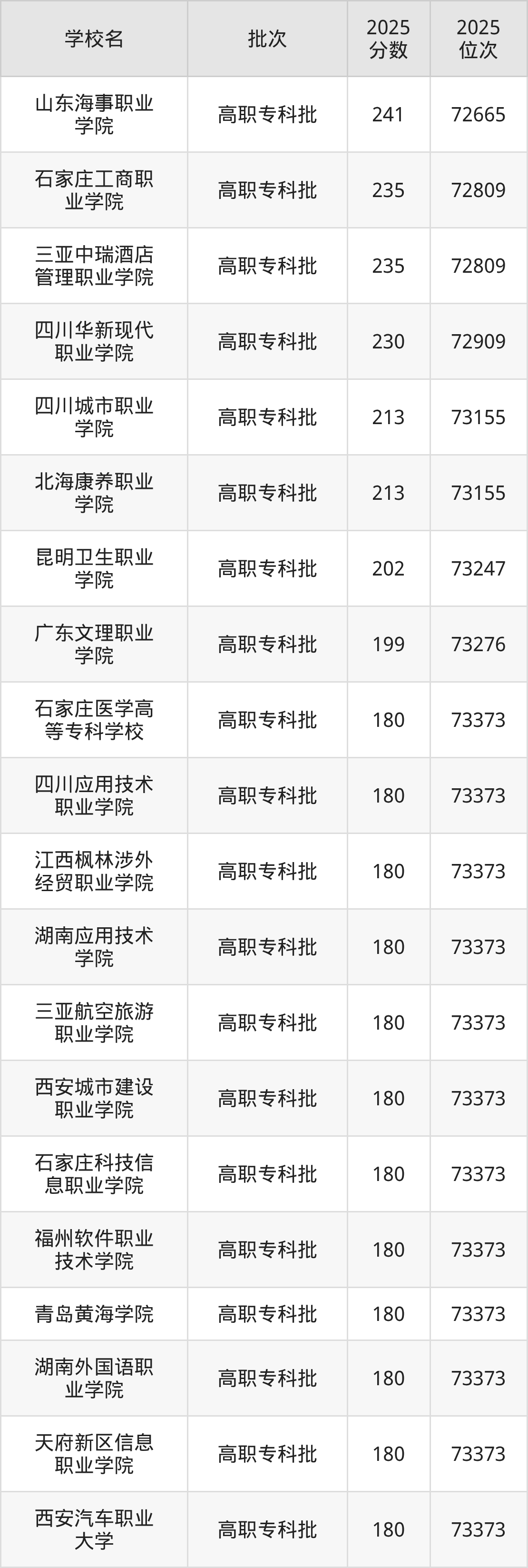 2025年重庆高考历史类223分(73004名~73018名)录取位次低于该区间(较稳妥)的有四川城市职业学院(73155名)、北海康养职业学院(73155名)等;录取位次高于该区间(可冲)的有四川华新现代职业学院(72909名)、三亚中瑞酒店管理职业学院(72809名)等。