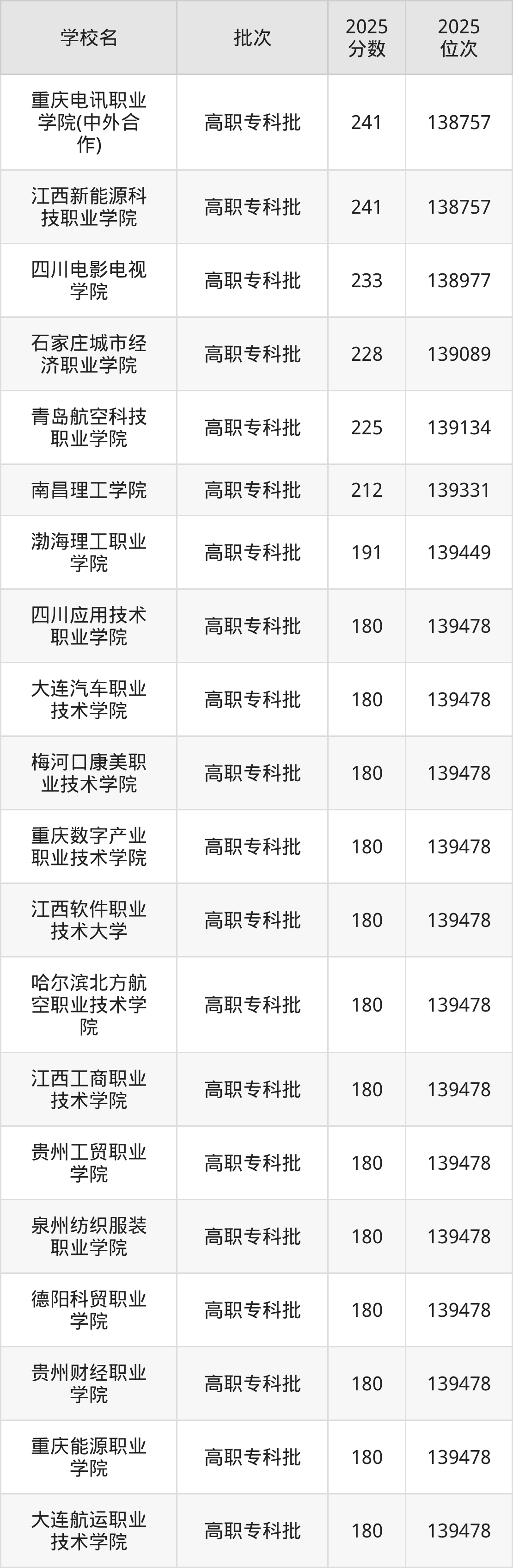 2025年重庆高考物理类223分(139151名~139170名)录取位次低于该区间(较稳妥)的有南昌理工学院(139331名)、渤海理工职业学院(139449名)等;录取位次高于该区间(可冲)的有青岛航空科技职业学院(139134名)、石家庄城市经济职业学院(139089名)等。