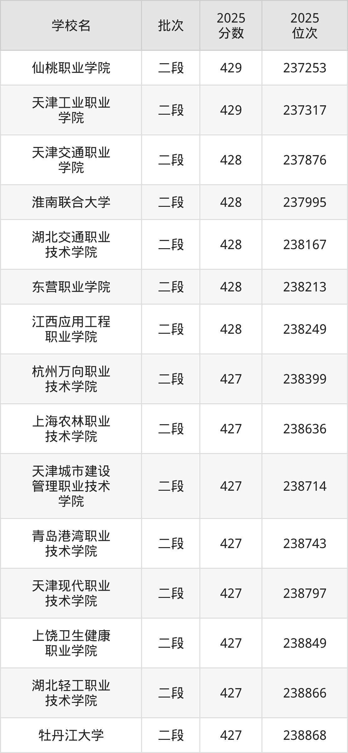 2025年浙江高考428分(237730名~238373名)能上的大学有江西应用工程职业学院、淮南联合大学、天津交通职业学院、东营职业学院等。