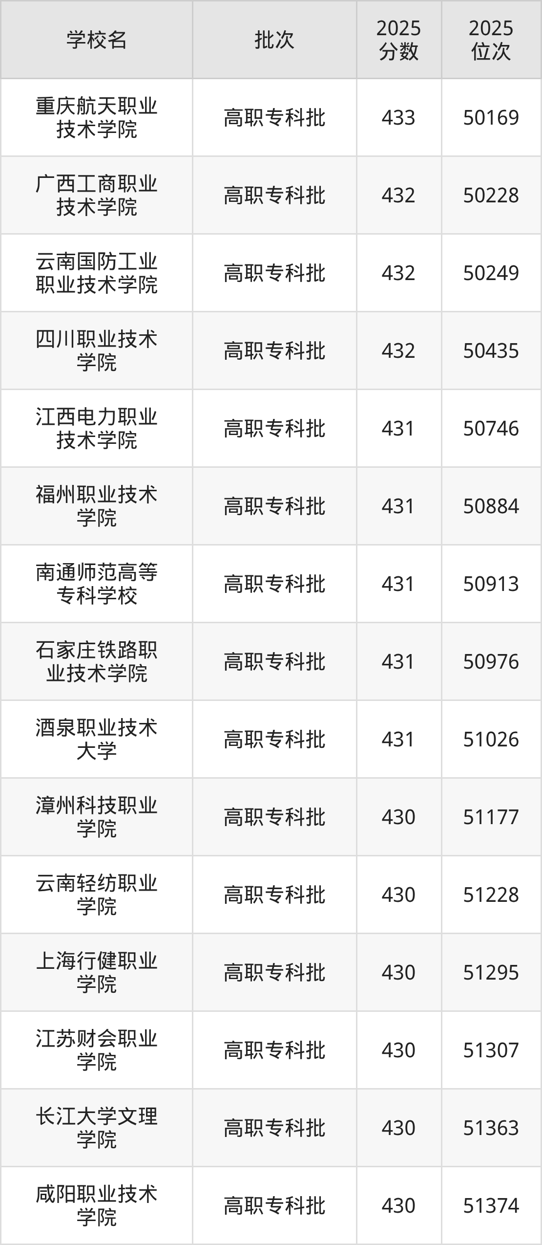 2025年贵州高考历史类431分(50660名~51062名)能上的大学有南通师范高等专科学校、酒泉职业技术大学、江西电力职业技术学院、石家庄铁路职业技术学院等。