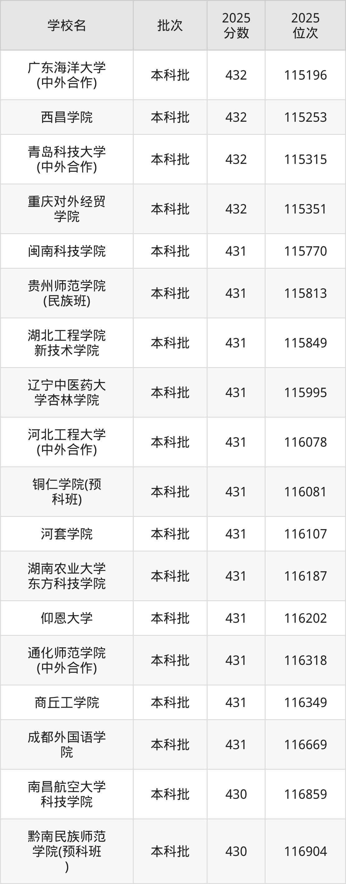 2025年贵州高考物理类431分(115644名~116698名)能上的大学有湖北工程学院新技术学院、河北工程大学(中外合作)、通化师范学院(中外合作)、河套学院等。