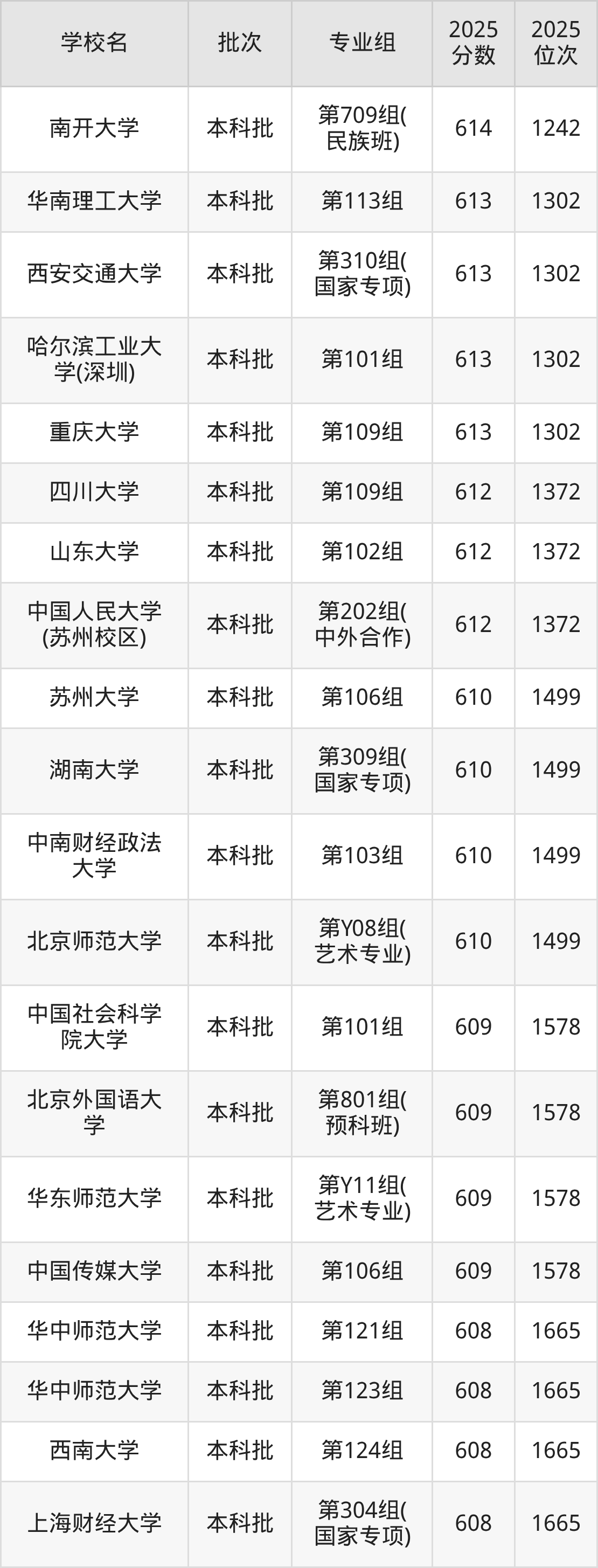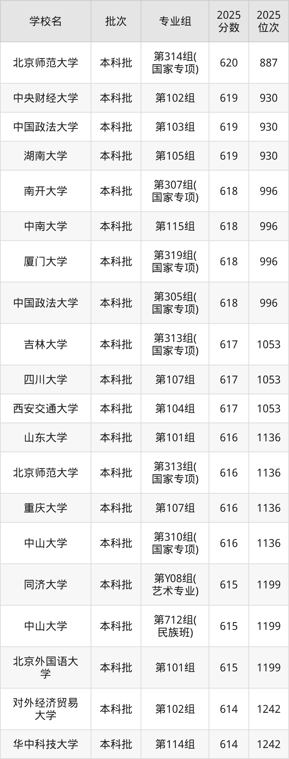 2025年湖南高考历史类611分(1373名~1434名)录取位次低于该区间(较稳妥)的有北京师范大学第Y08组(艺术专业)(1499名)、中南财经政法大学第103组(1499名)等;录取位次高于该区间(可冲)的有山东大学第102组(1372名)、中国人民大学(苏州校区)第202组(中外合作)(1372名)等。
