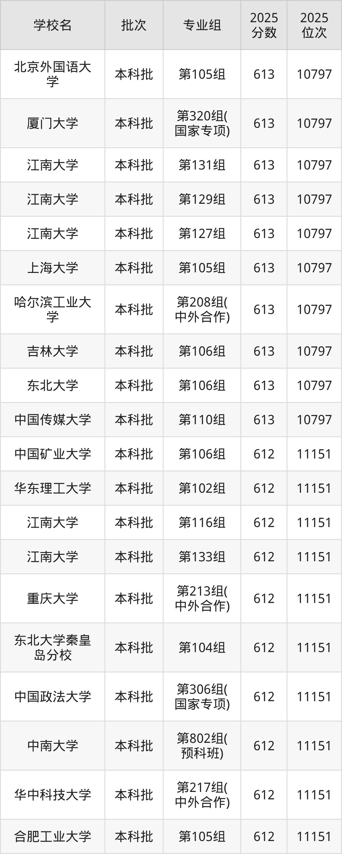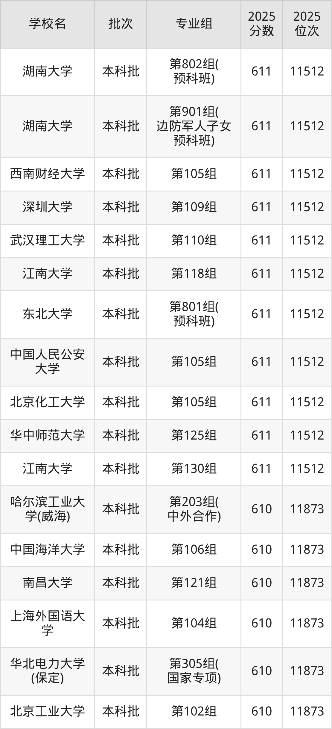 2025年湖南高考物理类611分(11152名~11512名)能上的大学有北京化工大学第105组、中国人民公安大学第105组、东北大学第801组(预科班)、江南大学第118组等。