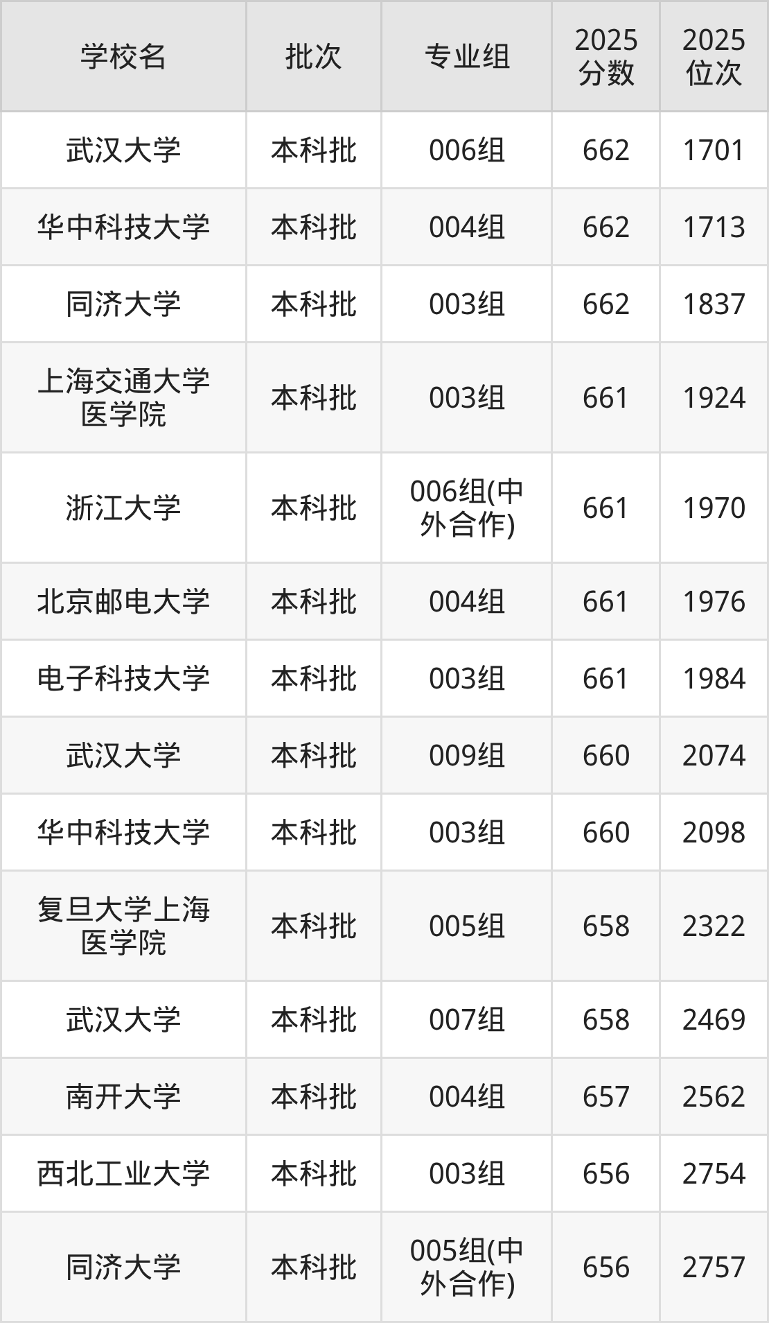 2025年安徽高考物理类659分(2153名~2307名)录取位次低于该区间(较稳妥)的有复旦大学上海医学院005组(2322名)、武汉大学007组(2469名)等;录取位次高于该区间(可冲)的有华中科技大学003组(2098名)、武汉大学009组(2074名)等。