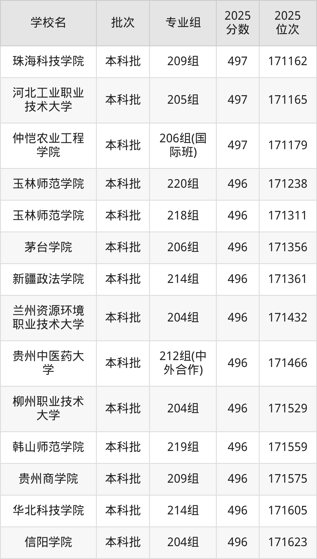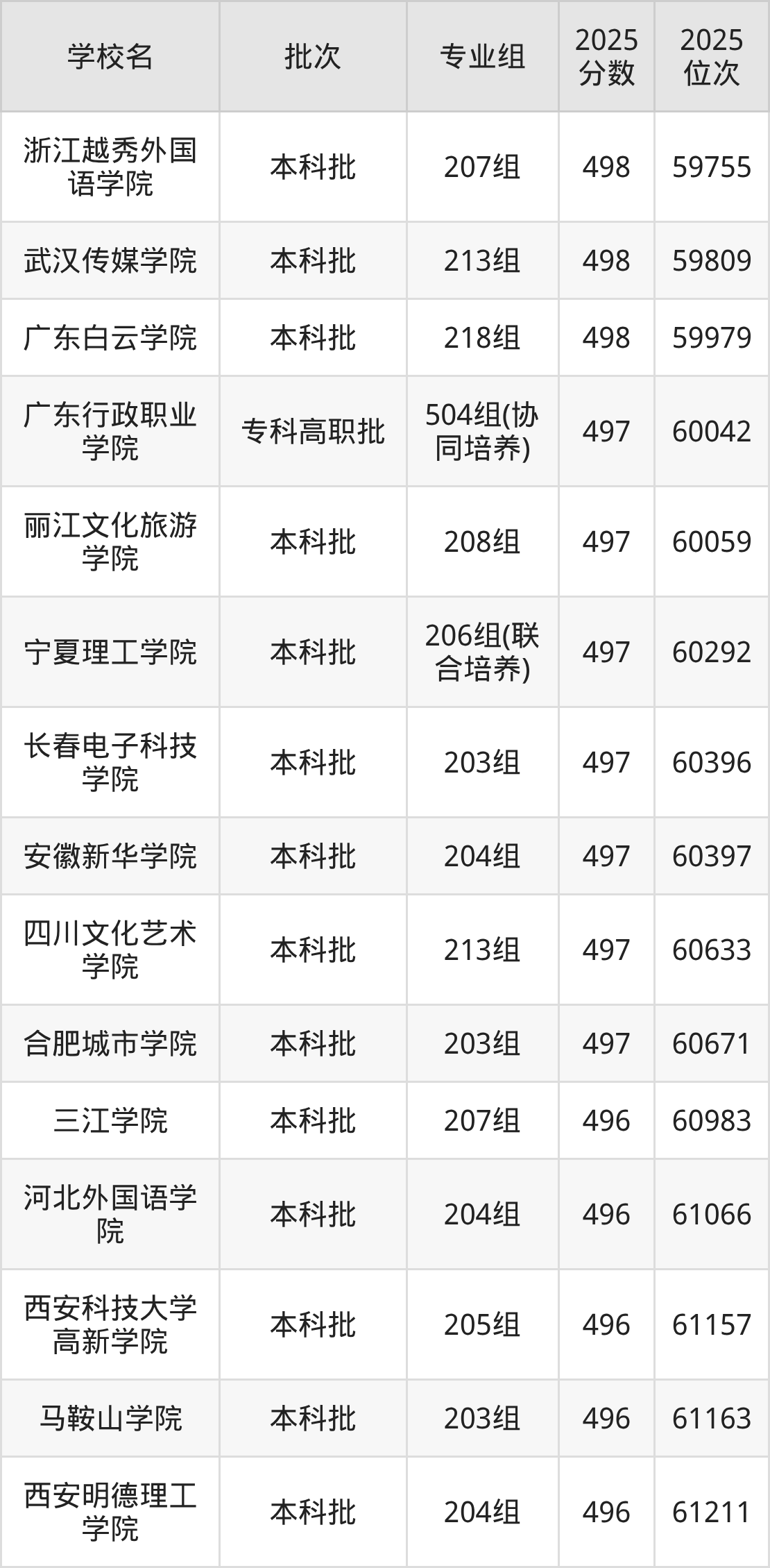 2025年广东高考历史类497分(60017名~60861名)能上的大学有安徽新华学院204组、宁夏理工学院206组(联合培养)、丽江文化旅游学院208组、长春电子科技学院203组等。