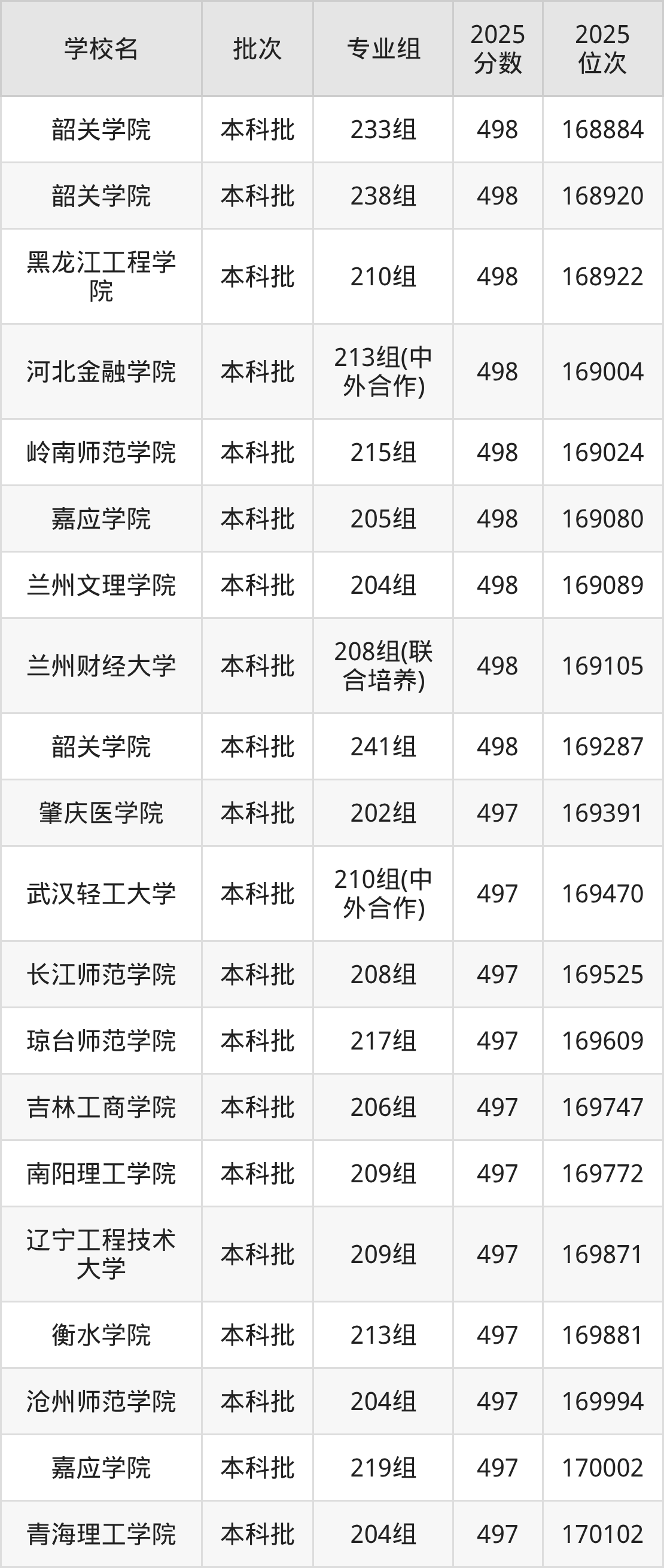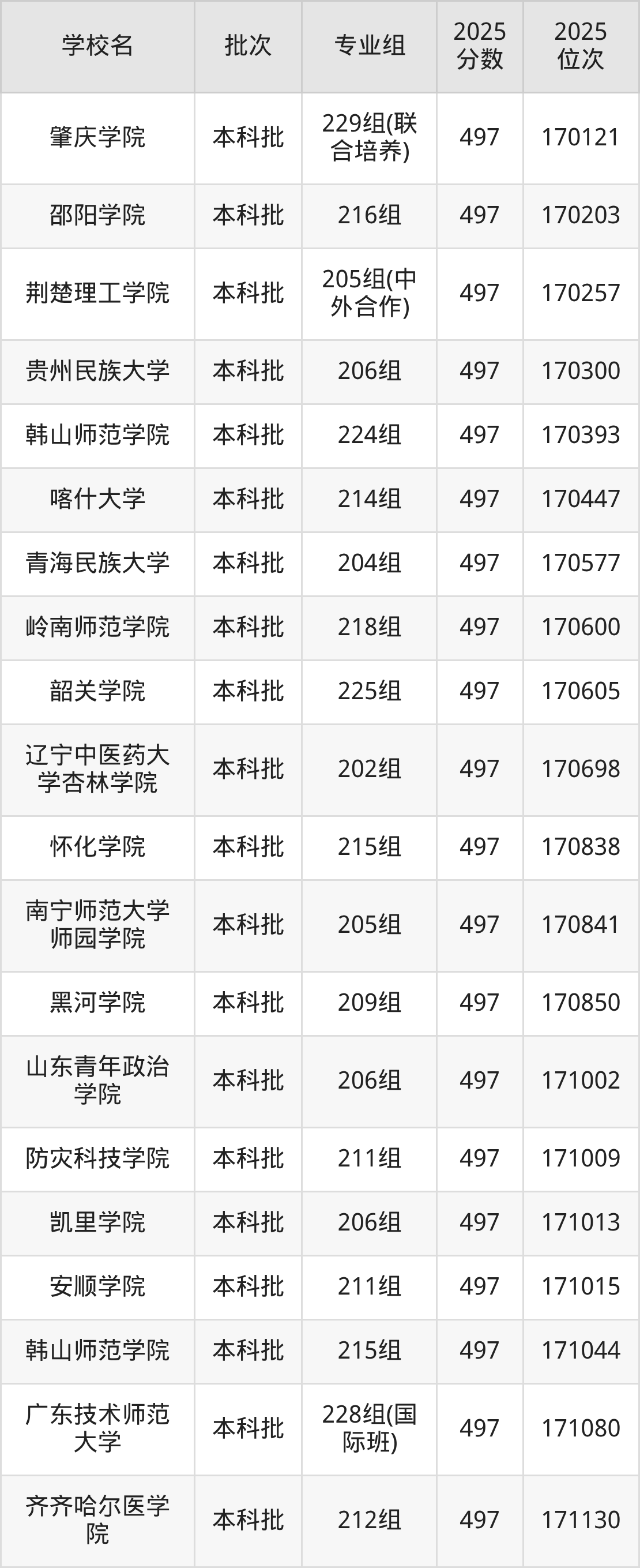 2025年广东高考物理类497分(169298名~171228名)能上的大学有衡水学院213组、沧州师范学院204组、辽宁工程技术大学209组、武汉轻工大学210组(中外合作)等。