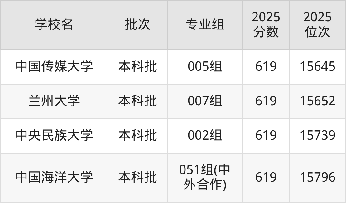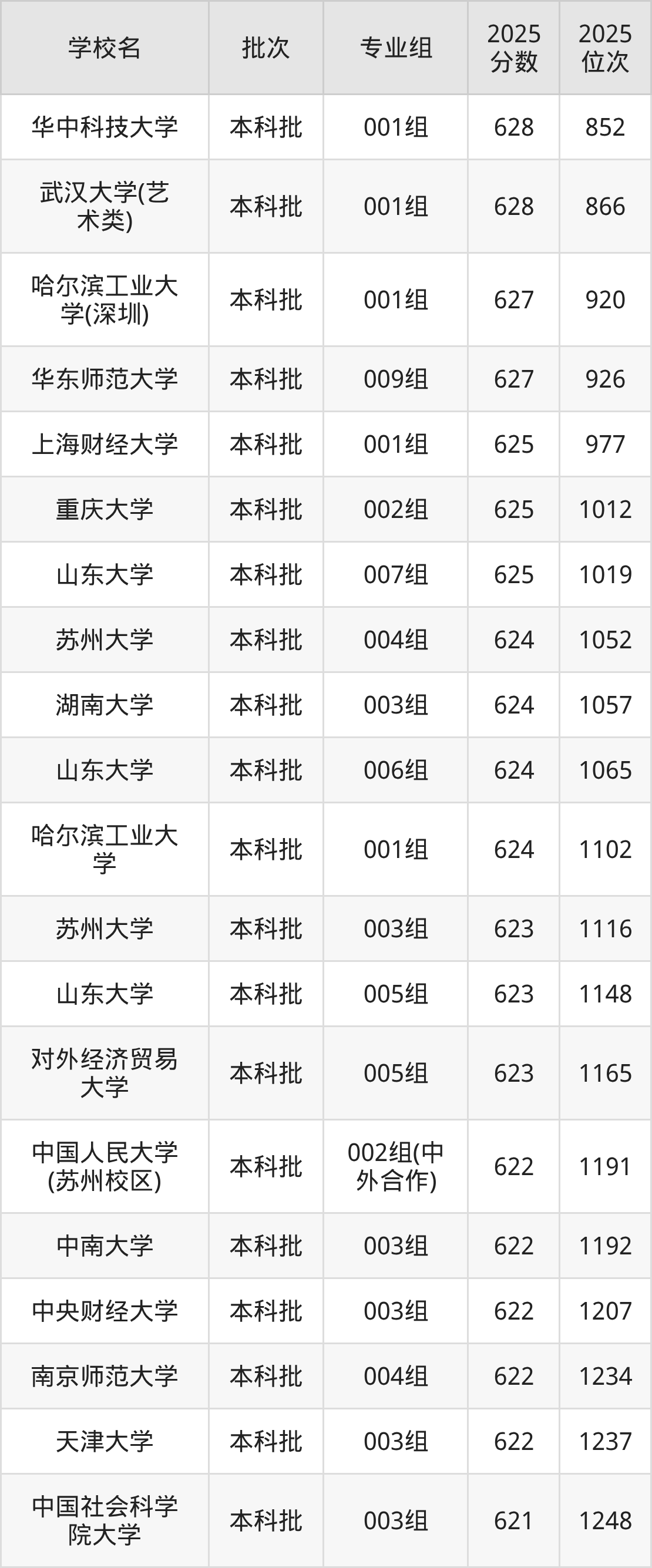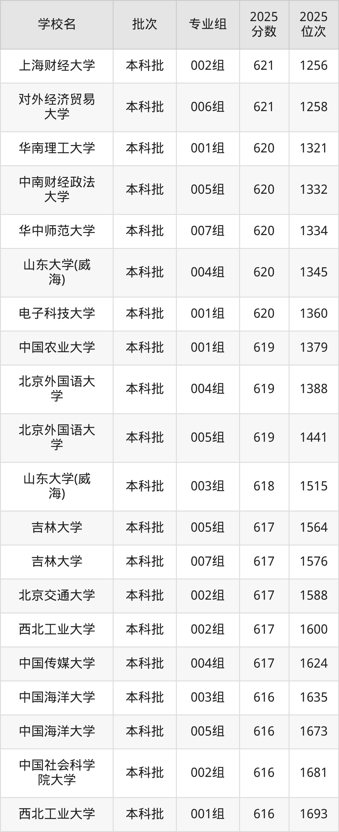 2025年安徽高考历史类620分(1311名~1375名)能上的大学有电子科技大学001组、华南理工大学001组、华中师范大学007组、山东大学(威海)004组等。