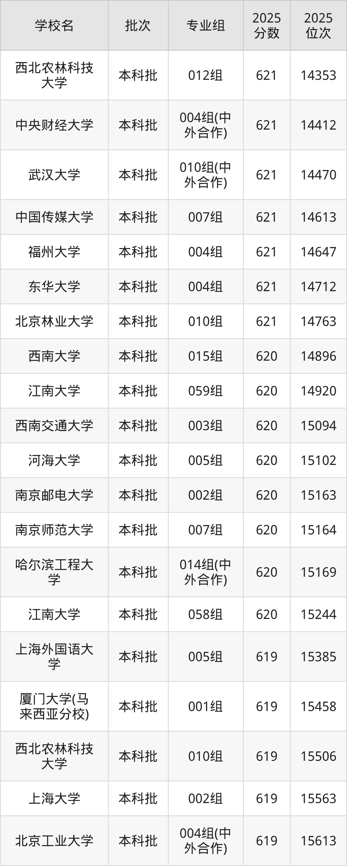 2025年安徽高考物理类620分(14827名~15329名)能上的大学有哈尔滨工程大学014组(中外合作)、河海大学005组、江南大学058组、江南大学059组等。