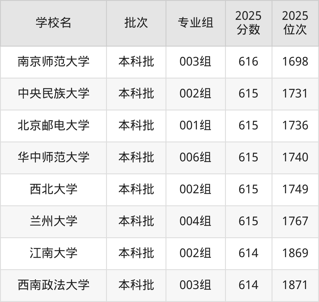 这些都是2026年高考历史类1311名~1375名考生可以报考的大学,更多学校名单如下表所示: