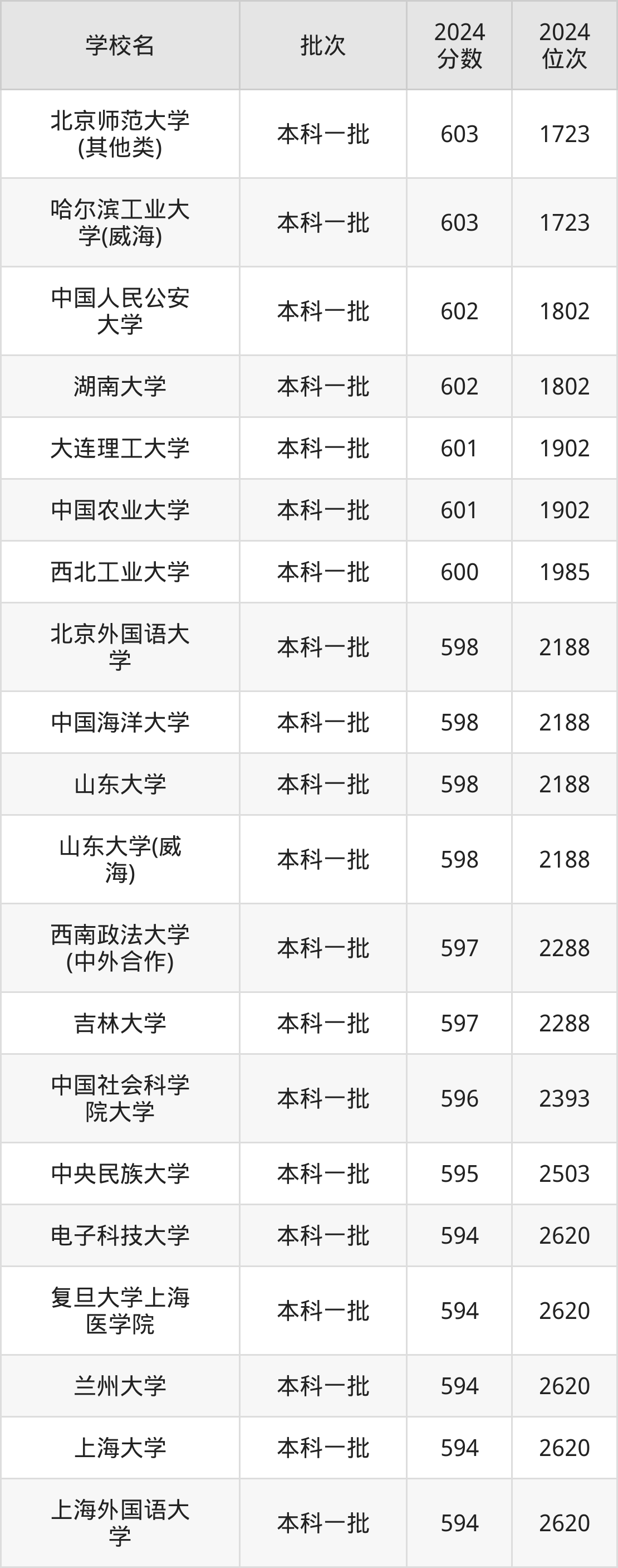 另外录取位次低于该区间(较稳妥)的有中国社会科学院大学(2393名)、中央民族大学(2503名)等;录取位次高于该区间(可冲)的有北京外国语大学(2188名)、山东大学(威海)(2188名)等。