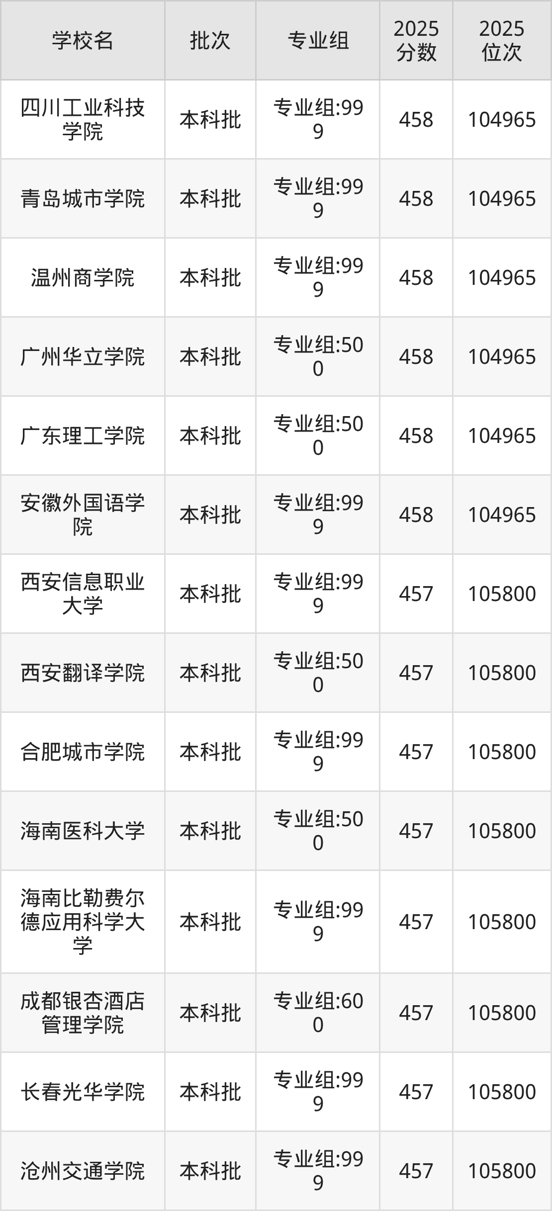 2025年福建高考物理类457分(104966名~105800名)能上的大学有沧州交通学院专业组:999、长春光华学院专业组:999、成都银杏酒店管理学院专业组:600、海南比勒费尔德应用科学大学专业组:999等。